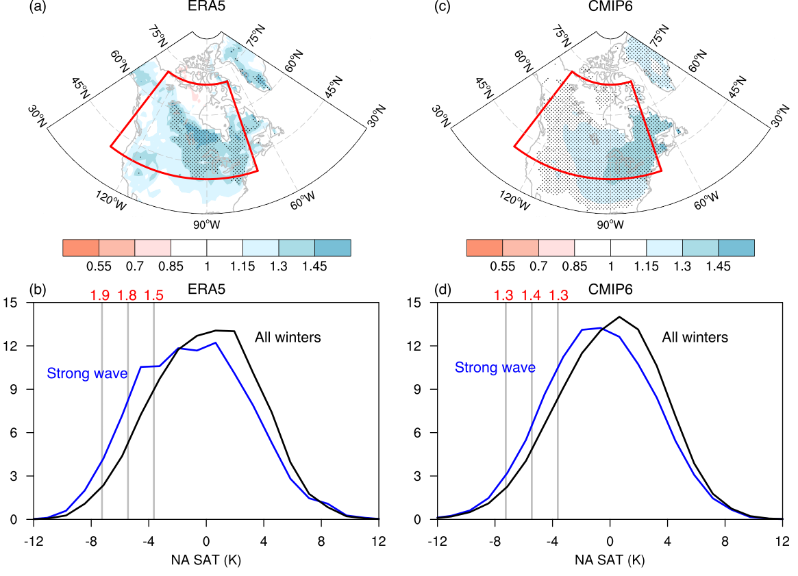 Recent studies have shed new light on the role of strong stratospheric waves in shaping surface weather conditions. While traditionally associated with the occurrence of SSWs, these waves have now been recognized for their direct influence on surface air temperature. Building upon this understanding, our research provides compelling evidence for the connection between strong stratospheric waves and sub-seasonal fluctuations between warm and cold spells over North America in observations and climate models. Particularly, when strong stratospheric wave events occur, there is an increased risk of cold extremes over North America 5–25 days later. Compared to all the winter days, strong stratospheric waves enhance the risk by about 30% across much of Canada and the northeastern U.S. (Fig. 2a). Furthermore, the distribution of area-averaged temperature anomalies (red boxes in Fig. 2a) clearly shifts towards colder temperatures during days 5–25 (blue) compared with normal winter days (black) (Fig. 2b). These findings are very different from the surface signatures one typically expects from SSWs, which exhibit more persistent cold spells that are weaker in magnitude over North America, pointing to a distinct physical mechanism.
