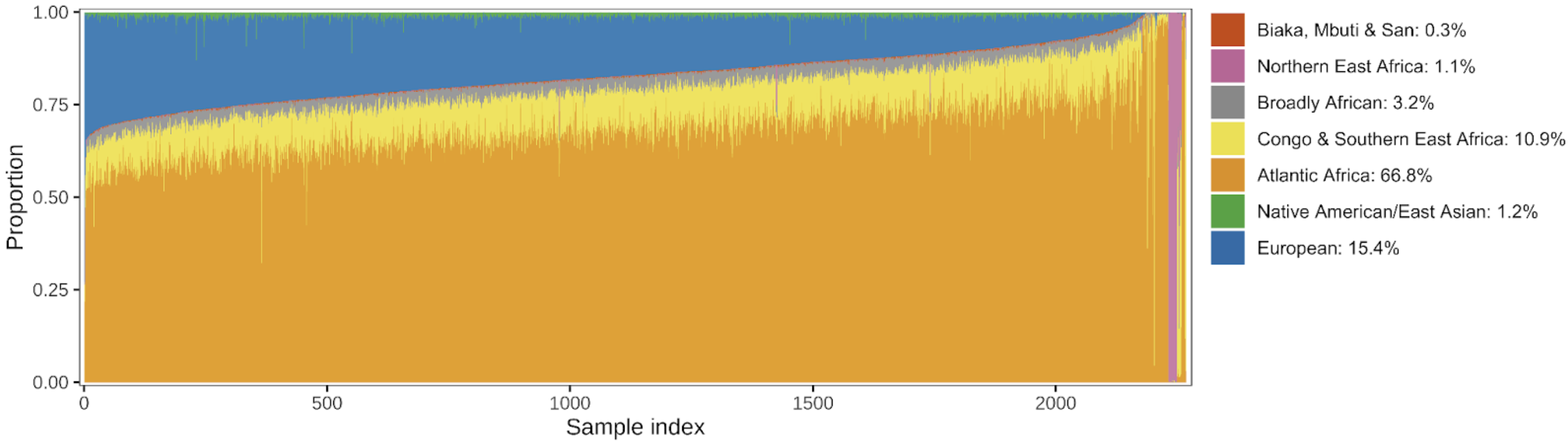 Figure 1. The ancestry composition of our reference panel. Estimated ancestry proportions for each of the 2,269 sequenced individuals in the AFAM panel. Only African regions and other regions that contributed substantially to admixture were included. Each column represents an individual colored by their respective estimated ancestry.