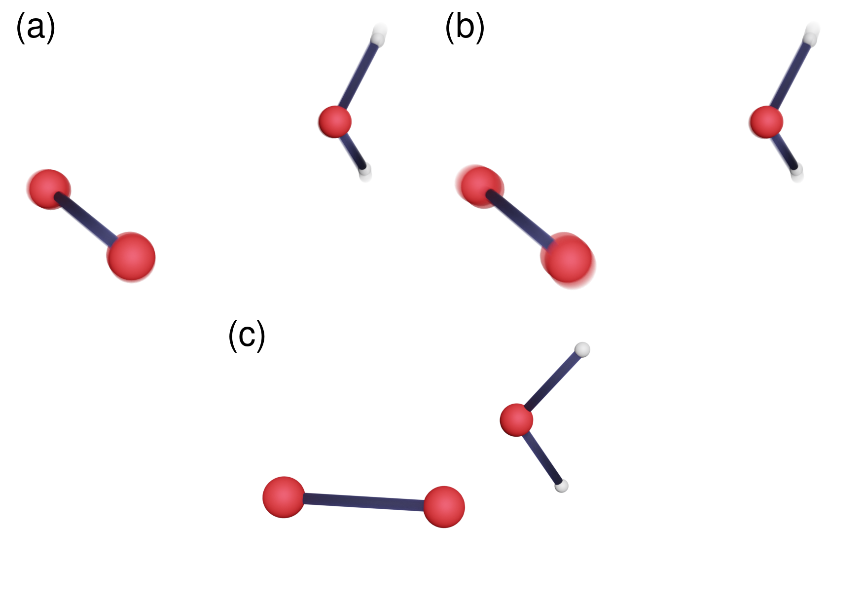 Figure 1:  The tunnelling mechanism  for the decay of singlet oxygen in (a) water and (b) deuterated water, and (c)  the geometry at the minimum-energy crossing point (MECP). The motion of the atoms involved in the tunnelling mechanism in (a) and (b) is depicted by a motion blur.