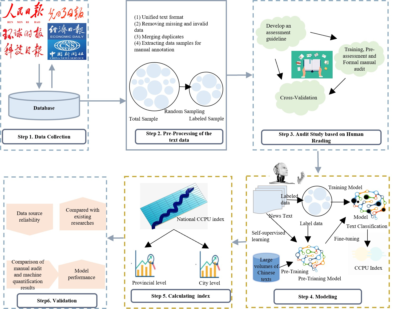 To fill in this gap, our team adopts the similar methodology used by Gavriilidis (2021) to construct a Chinese version of CPU, named as CCPU index. The CCPU index is based on 1,755,826 news articles from six main newspapers in China, namely, the People’s Daily, Guangming Daily, Economic Daily, Global Times, Science and Technology Daily, and the China News Service. These newspapers are normally considered the main official media outlets in China, offering extended official information to the public. Figure 1 provides a general illustration of our research framework, which contains six main steps from data collection, pre-processing, manual auditing, modelling, index construction, and finally to validation.