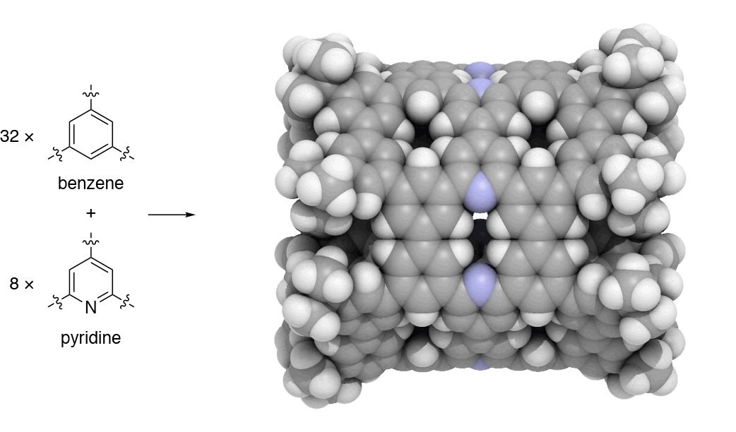 Since 2017, our group has undertaken a campaign to design nanocarbon molecules by using 1,3,5-trisubstituted benzene (phenine) as basic trigonal planar units. This phenine strategy is so concise and versatile that it can take advantage of a wealth of modern coupling reactions, and bowl-, saddle-, cylinder-, and hemisphere-shaped nanocarbon molecules have already been synthesized within three years. In our work published in Nature Communications, we introduce another simple yet bold strategy to dope heteroatoms in nanocarbon molecules. To dope nitrogen, for instance, we simply use pyridine in place of benzene to assemble the phenine frameworks. As the first demonstration of this doping strategy, we focused on phenine nanotube molecules (pNTs) and periodically embedded nitrogen atoms and atom vacancy defects on a nanometer-sized cylinder. It took only a few months to complete a ten-step synthesis that assembles 32 benzene units and 8 pyridine units in the form of the nitrogen-doped pNT (NpNT) C296H256N8 with a molecular weight of 3923 (Fig. 1).