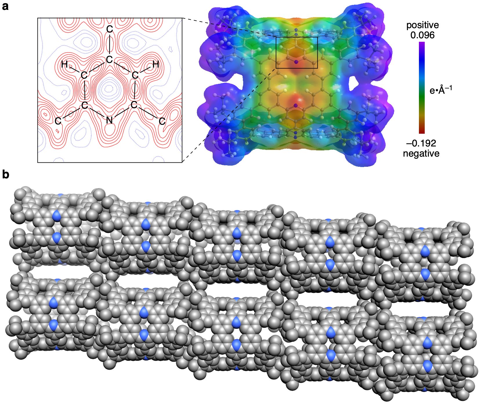 As a fruitful, extra bonus of the aspherical models, we succeeded in locating and visualizing lone pairs on nitrogen (Fig. 3). Intrinsically, the lone pairs increased the electron densities around the nitrogen atoms, which was further visualized in experimental electrostatic potential maps with the most negative (–0.192-e•Å–1) area covering nitrogen atoms. The negative nitrogen atoms were also found to be effective in altering optical properties. With the nitrogen atoms embedded periodically in the cylinder, the cylinder alignment in the crystal resulted in the periodic positioning of nitrogen atoms around tubular nanopores. Our synthetic doping strategy will facilitate the exploration of heteroatom-doped nanocarbon molecules.
