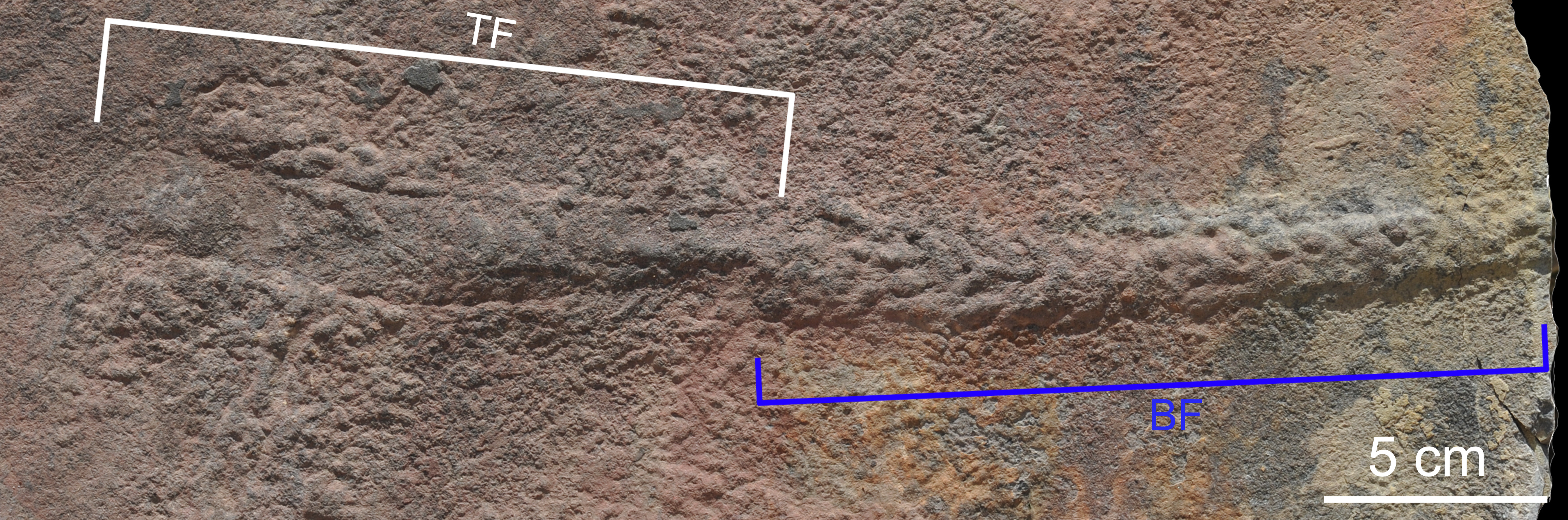 Yilingia spiciformis (BF: body fossil) and associated mortichion (TF: trace fossil).