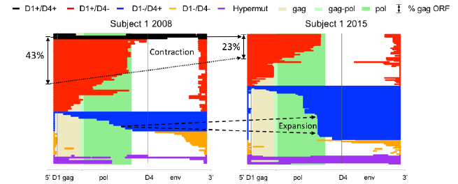 We next asked if we could identify selective pressure against a given HIV protein among the defective proviruses, inferred from a decrease in the relative abundance of its intact ORF. We performed this analysis for each HIV protein, and unexpectedly only found evidence for selection against proviruses containing intact Gag, which is known to be less toxic than most other HIV proteins. Furthering our analysis, we searched for the presence of genetic elements important for HIV expression, such as splice sites. We combined these analyses to determine if we could identify patterns of selection. We labeled proviruses with 3’ deletions red and proviruses with 5’ deletions blue (SEE FIGURE). An immediate pattern, based on relative abundance, emerged from the deletion map: proviruses with 3’ deletions tended to contract (red), while the 5’-deleted proviruses (blue) tended to expand over time. Moreover, among the