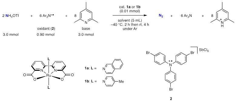 Focusing on the similarity in structure and physical properties between NH3 and H2O, we envisaged that the ruthenium complexes known as water oxidation catalysts can be potential candidates to achieve the catalytic conversion of ammonia into dinitrogen. In water oxidations, cerium(IV) salts have usually been used as oxidants. At first, we carried out the reaction using cerium salts like water oxidation reactions, but no dinitrogen was generated at all. Then, we changed the oxidant from cerium(IV) salts to triarylaminium radicals which are capable of coexisting with bases. Thus, we found the catalytic ammonia oxidation reactions. The optimized reaction system is as follows: the reaction of ammonium trifluoromethane sulfonate (NH4OTf, 3.0 mmol) as an ammonia source, tris(4-bromophenyl)aminium hexachloroantimonate (2, 0.90 mmol) as an oxidant and 2,4,6-collidine (3.0 mmol) as a base in the presence of a catalytic amount of ruthenium catalyst (1a or 1b, 0.01 mmol) was carried out in acetonitrile.