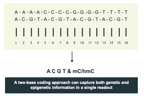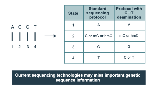 However, capturing both genetic and epigenetic information simultaneously comes with significant challenges due to the limitations of current sequencing technology. Next generation sequencing technologies only capture four letters or information states in their readout, the canonical bases A, T, C, and G. Base conversion chemistries can be used to differentiate unmodified C from its most prevalent epigenetic variants, 5mC and 5hmC, but this means sacrificing one of the information states (typically the T state) and missing important genetic sequence information.