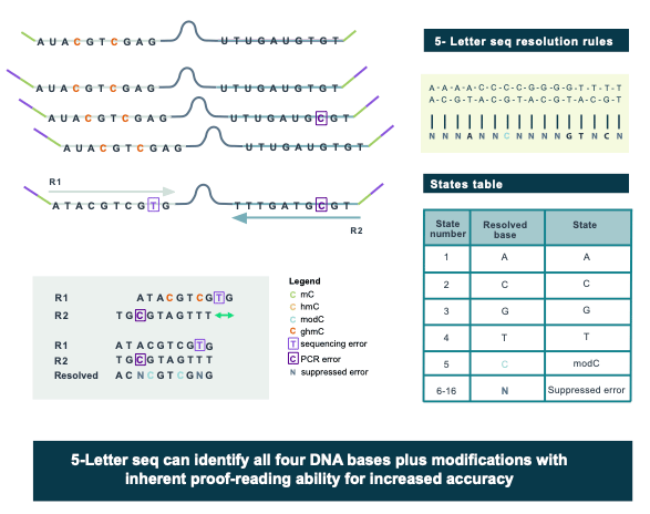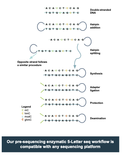 To overcome these challenges of combined genetic and epigenetic analysis, we developed 5-Letter seq, a whole genome methodology that can capture all four canonical bases as well as modified C in a single workflow that is compatible with any sequencing platform. Our platform consists of a pre-sequencing enzymatic workflow that uses standard molecular biology techniques to prepare the sample for sequencing, as well as decoding software to resolve the raw sequencing data. In this work, we used an Illumina NovaSeq NGS instrument, but other sequencing adapters can be substituted, meaning the workflow can be used with any sequencing platform capable of decoding at least four genetic bases.