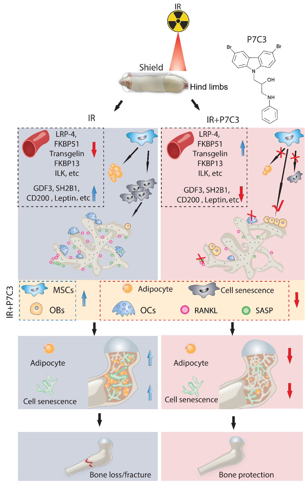 Figure. The protective effect provided by P7C3 against IR-induced bone loss. Exogenous administration of 20 mg/kg P7C3 shifts the pathological environment induced by irradiation from favoring osteoclastogenesis into osteogenesis and reduces bone marrow adipogenesis and cell senescence, thereby significantly protecting bone from IR-mediated bone loss and fracture in vivo.