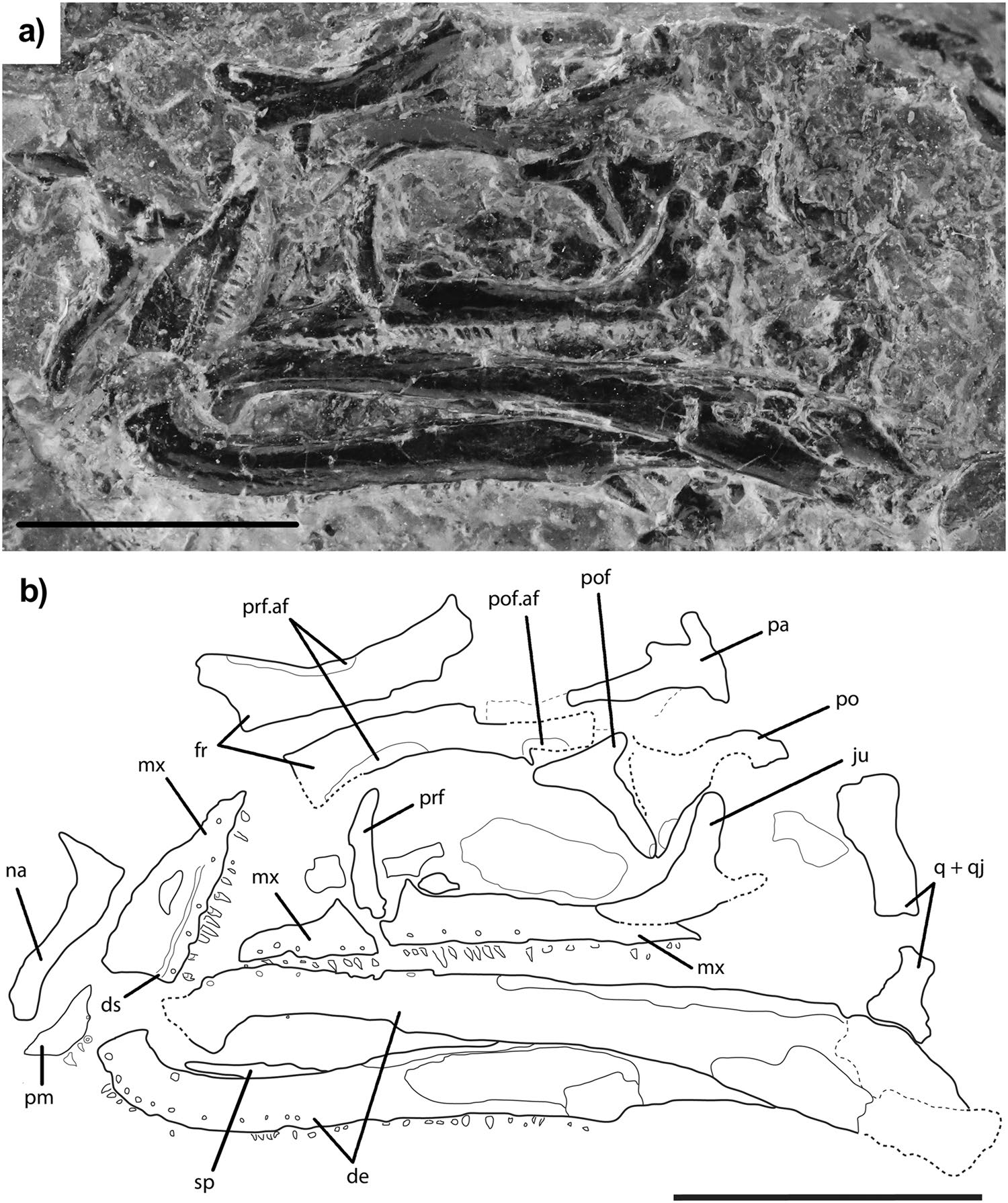 This Thursday, I had the opportunity to publish with two colleagues, Dr. Gabriela Sobral and Dr. Rainer Schoch (from the Staatliches Museum für Naturkunde, in Stuttgart), a new species of early evolving lepidosauromorph from Vellberg, named Vellbergia bartholomaei. This new species has an unusual mosaic of features that were previously unknown to occur together in the same species of Triassic lepidosauromorph, as some of those features characterize different groups of lepidosauromorphs. Such features include the simultaneous retention of a splenial bone in the lower jaw and the location of the dentition (apically on the jaw bone). This aspect of the dentition evolved independently at least five other times within lepidosauromorphs, including most members of the tuatara lineage (rhynchocephalians), of which the oldest known member was found in…Vellberg! The recognition of Vellbergia as one of the first evolving species of the lepidosauromorph tree of life indicates there were not five, but at least six instances of independent acquisition of this mode of tooth implantation. It also shows that evolutionary convergence of this feature was already ongoing among the oldest known lizard-like reptiles.