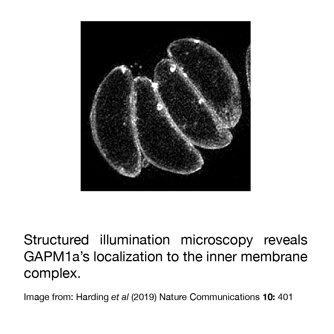Harding wanted to know if GAPM1a attaches cortical microtubules to the IMC directly, or if there are intermediate factors, and so she tried to image the microtubules as GAPM1a was depleted in a conditional mutant. She needed the resolution of structured illumination microscopy to see the spacing between the microtubules, however, and phototoxicity killed the parasites before GAPM1a was sufficiently depleted. Recent advances in confocal imaging have made it possible to image cells gently while still resolving small structures, however. Harding plans to try applying this technology to GAPM1a in hopes of seeing how the kinetics of GAPM1a depletion line up with microtubule dissolution.
