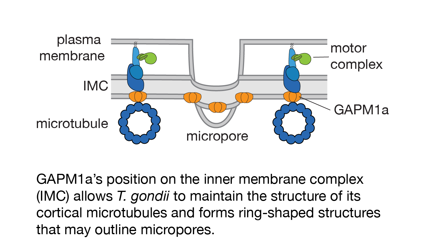 Each parasite has twenty-two evenly spaced microtubules that originate at a ring near its tip and spiral down two thirds of the cell. In the absence of GAPM1a, parasites lose this regular arrangement. Instead, microtubules begin to depolymerize, clumping together in the process and leaving large areas of the cell devoid of support. The resulting loss of structural integrity eventually kills the parasites.