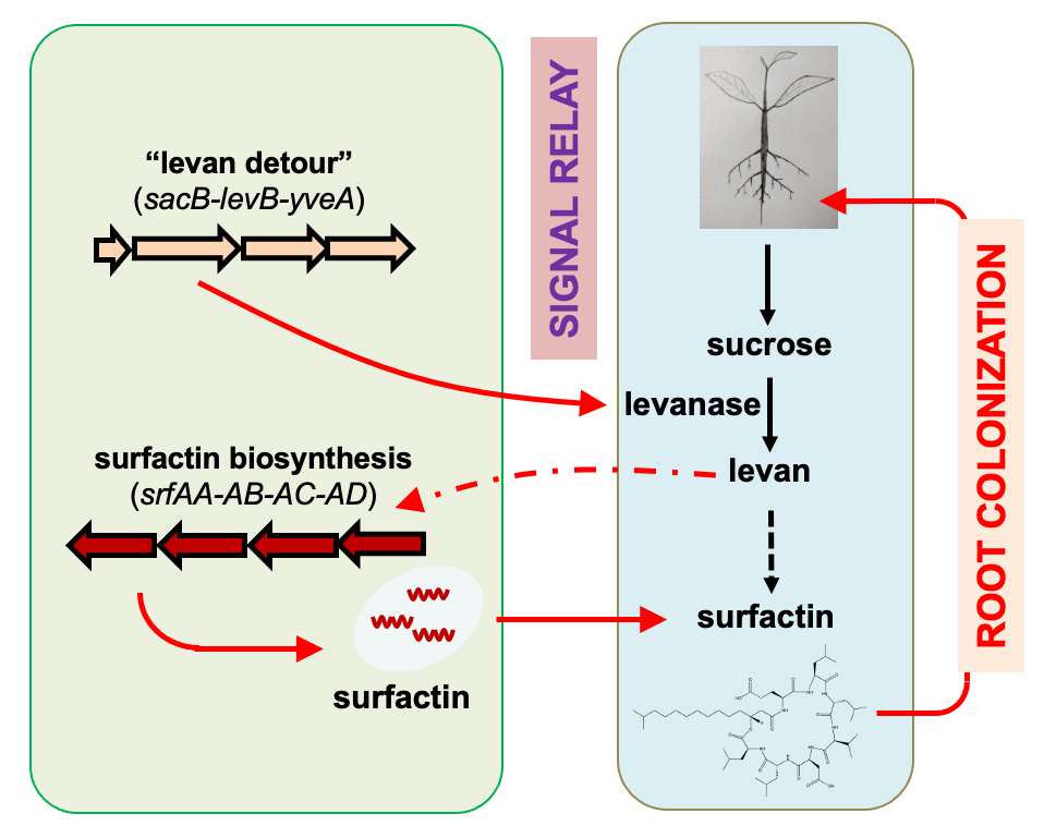 Figure 1. A cartoon demonstrates a signal relay from sucrose to levan and to surfactin that triggers root colonization by the soil bacterium B. subtilis. Sucrose is converted to levan by a levansucrase (SacB) in the “levan detour”, which then stimulates surfactin production.