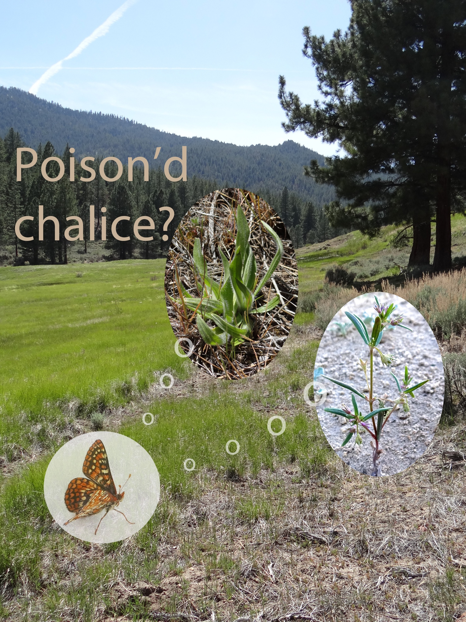 The collage below shows our imagination of a female Edith's checkerspot in Schneider's Meadow, asking herself which of the host-plants she perceives is the "poison'd chalice:" the exotic plantain (top) or her still-available traditonal host, Collinsia parviflora. Our study shows that, eventually, all of the butterflies chose the chalice, leading to their demise in 2007-8. A few years later, in 2013-4, checkerspots that had not undergone this bout of anthopogenic evolution recolonized the site and the host shift reversed itself, setting the stage for a potential repeat of the anthropogenic evolutionary cycle.