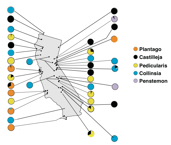 As a result of writing that one-page letter, I've spent 50 years studying the interconnectedness of Edith's checkerspot with its host plants. Females choose to lay their eggs on different plants at different sites, even when those sites support apparently identical plant communities. The map shows the spatial pattern, with pie diagrams representing the proportions of eggs laid on each host genus at each site.