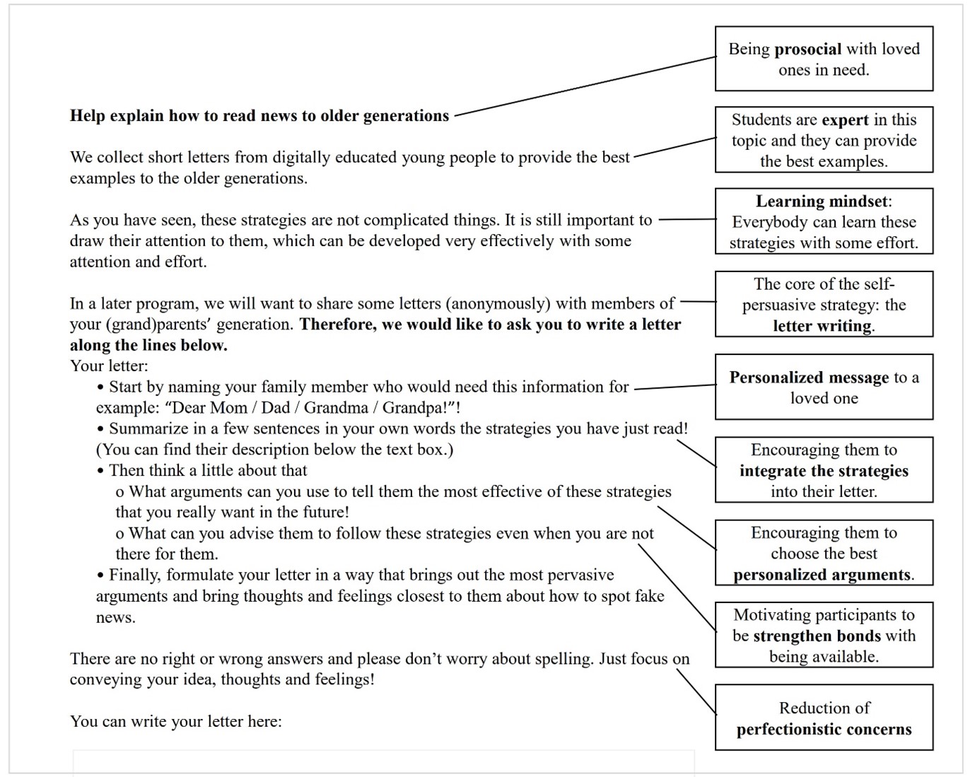 Moving beyond individual reasons to spot fake news: Though many previous studies focused on the individual cognitive capacities of news consumers to reduce susceptibility against misinformation (e.g., nudged people to spot fake news, motivated them to build digital competencies, or inoculated them with certain skills to approach the news with more suspicion), we rather turned toward prosocial motivations in the present fake news intervention and aimed to change the reasons and the meaning of why fake news detection can be (pro)socially important to the participants. Instead of putting participants in the inferior position of someone in need of learning to avoid incompetence, we addressed them as digital experts who can contribute to the digital competency of their loved ones.