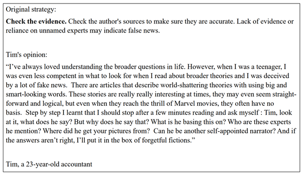 In the intervention material, the survey was framed as a contribution to an online media education program targeting parents’ and grandparents’ generations. First, participants reviewed six scientifically supported strategies (all adapted from Guess et al., 2020) explained through peer testimonials to spot online misinformation (skepticism for headlines; looking beyond fear-mongering; inspecting the source of news; checking the evidence; triangulation; considering if the story is a joke; see an example in Figure 1). Based on prior research, these testimonials were supposed to provide normative information about other students’ negative experiences of not spotting misinformation and positive experiences of identifying misinformation. Second, participants were requested to write a brief letter to a close family member in which they summarize the six strategies and were asked to reflect on the best arguments and advice that would convince their relatives to implement these strategies in their everyday lives (see Figure 2).