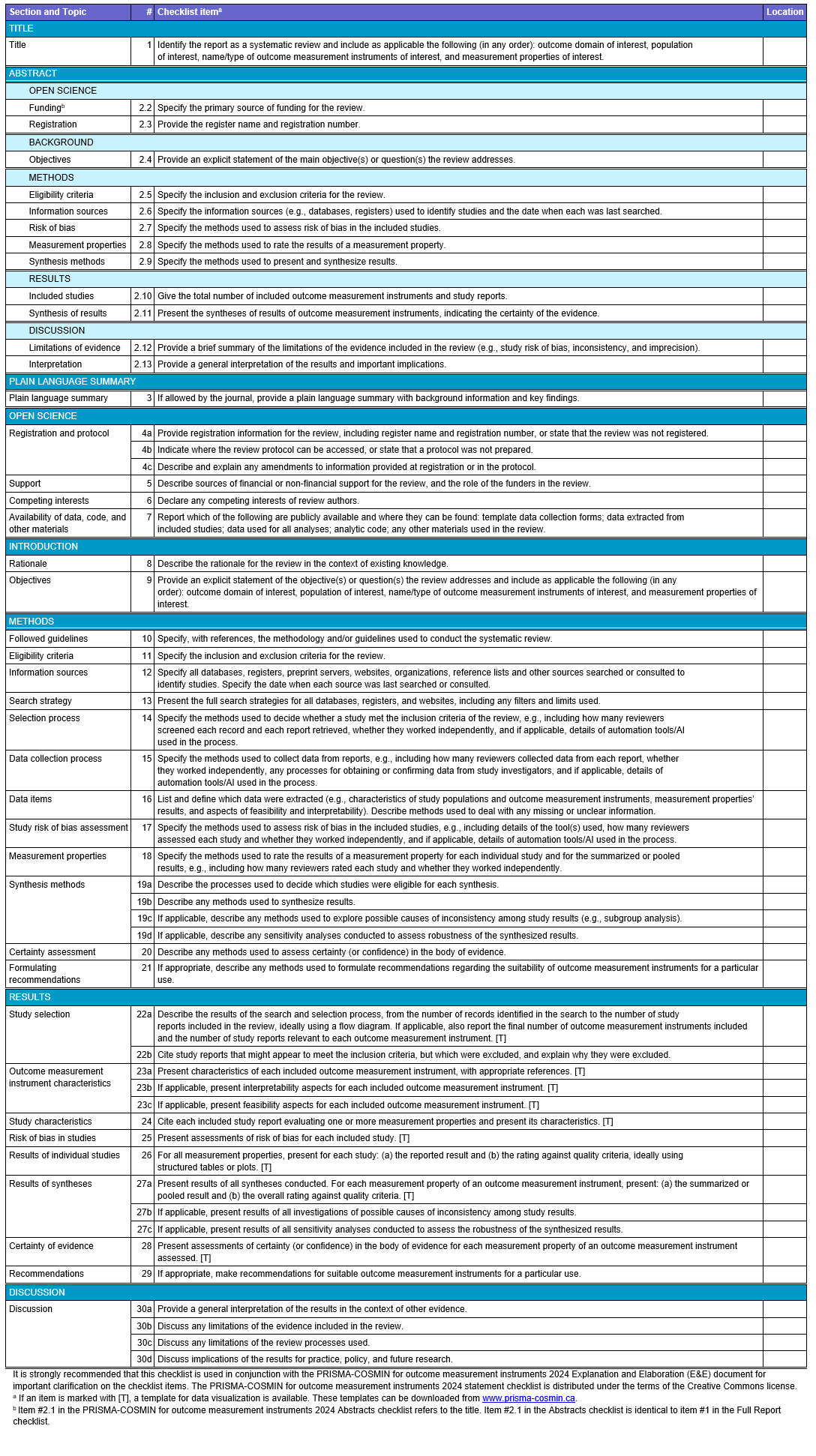 The resulting PRISMA-COSMIN for OMIs 2024 guideline comprises of a checklist for full systematic review reports and one for abstracts, along with Explanation and Elaboration (E&E) documents. The checklist for full reports contains 54 (sub)items covering various sections of a systematic review report, from the article’s title to the discussion (Table).