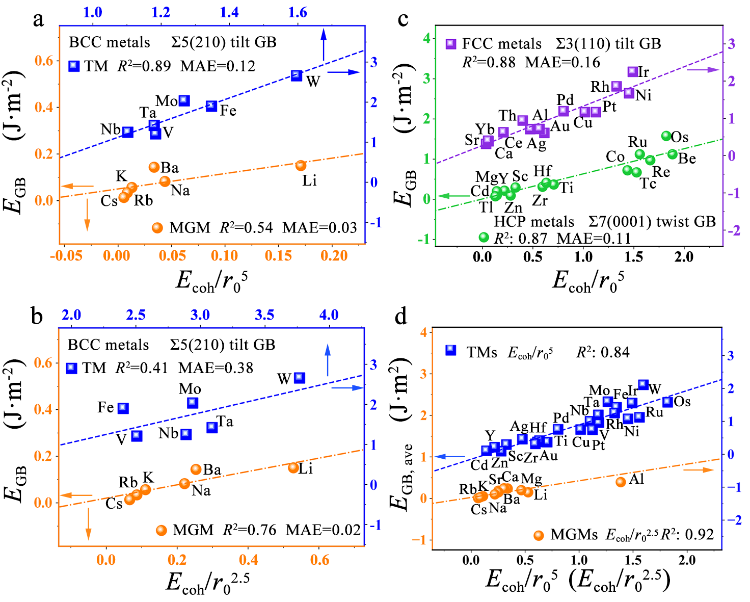 Figure 1. Grain-boundary (GB) energies (EGB) as the functions of our descriptors. GB energies with (a) Ecoh/r05 and (b) Ecoh/r02.5 for body-centered-cubic (BCC) metals. GB energies with (c) Ecoh/r05 for hexagonal-close-packed (HCP) and face-centered-cubic (FCC) metals. (d) The average GB energies with Ecoh/r05 for TMs and Ecoh/r02.5 for MGMs.
