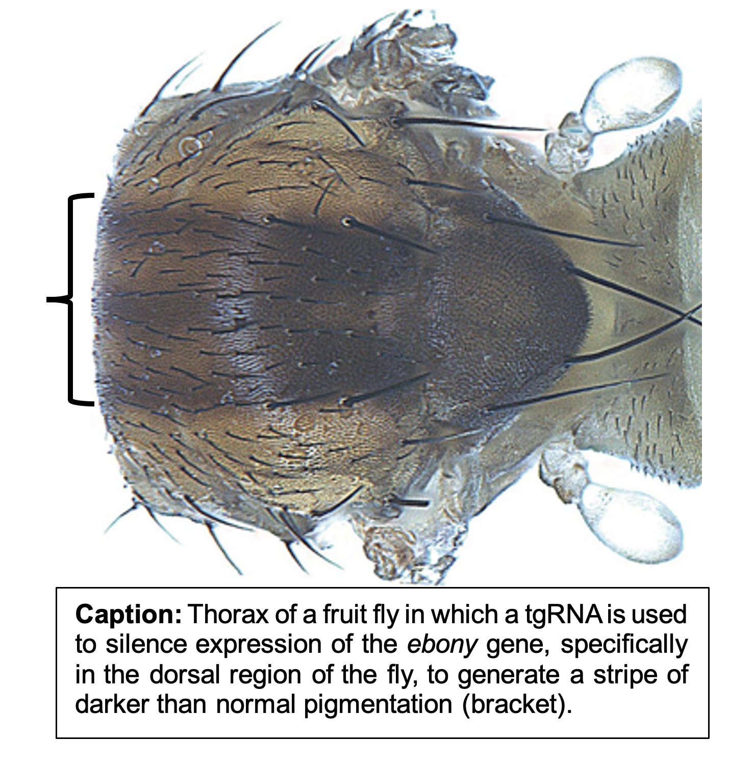 Current Study: Now, in a newly published study, Ankush Auradkar and colleagues devise a hybrid gene-drive system based on a combination of full-length and truncated gRNAs. In such drives, the active form of Cas9 is used to sustain both copying of the drive element (using the full-length gRNA) and modulation of gene expression by employing tgRNAs to either repress (tgCRISPRi) or activate (tgCRISPRa) transcription of secondary target genes without causing any genomic damage. Auradkar et al. show that tgRNAs targeting sites between the transcription start site (TSS) or upstream TATA boxes can lead to efficient gene knock-down (>80% reduction). This strategy can operate successfully for genes including a TATA box or not (TATA-less promoters). Also, fusing a transcriptional activation domain to the otherwise active Cas9 protein (Cas9-VPR) can lead to overexpression or mis-expression of the target gene. Furthermore, this scarless gene regulatory approach can be extended to target distant cis-acting regulatory elements (referred as enhancers or cis-regulatory modules = CRMs) of otherwise essential genes (i.e., genes whose function is required for organismal viability or fertility). Such CRM-targeted tgRNAs can either repress (Cas9) or activate (Cas9-VPR) target gene expression in limited regions of the organisms while preserving viability. For example, tgRNAs targeting a CRM of the HOX segment identity gene Sex Combs Reduced (Scr), which is required specifically for formation of male mating bristles, leads to a reduced number of such bristles. Likewise, tgRNAs targeting a repressor binding site in a CRM of the essential gene knirps, (which directs specific expression in the second longitudinal wing vein), leads to an anterior displacement of this vein in the presence of Cas9 due to reduced repression, while generating ectopic veins in the presence of the activating Cas9-VRP source.
