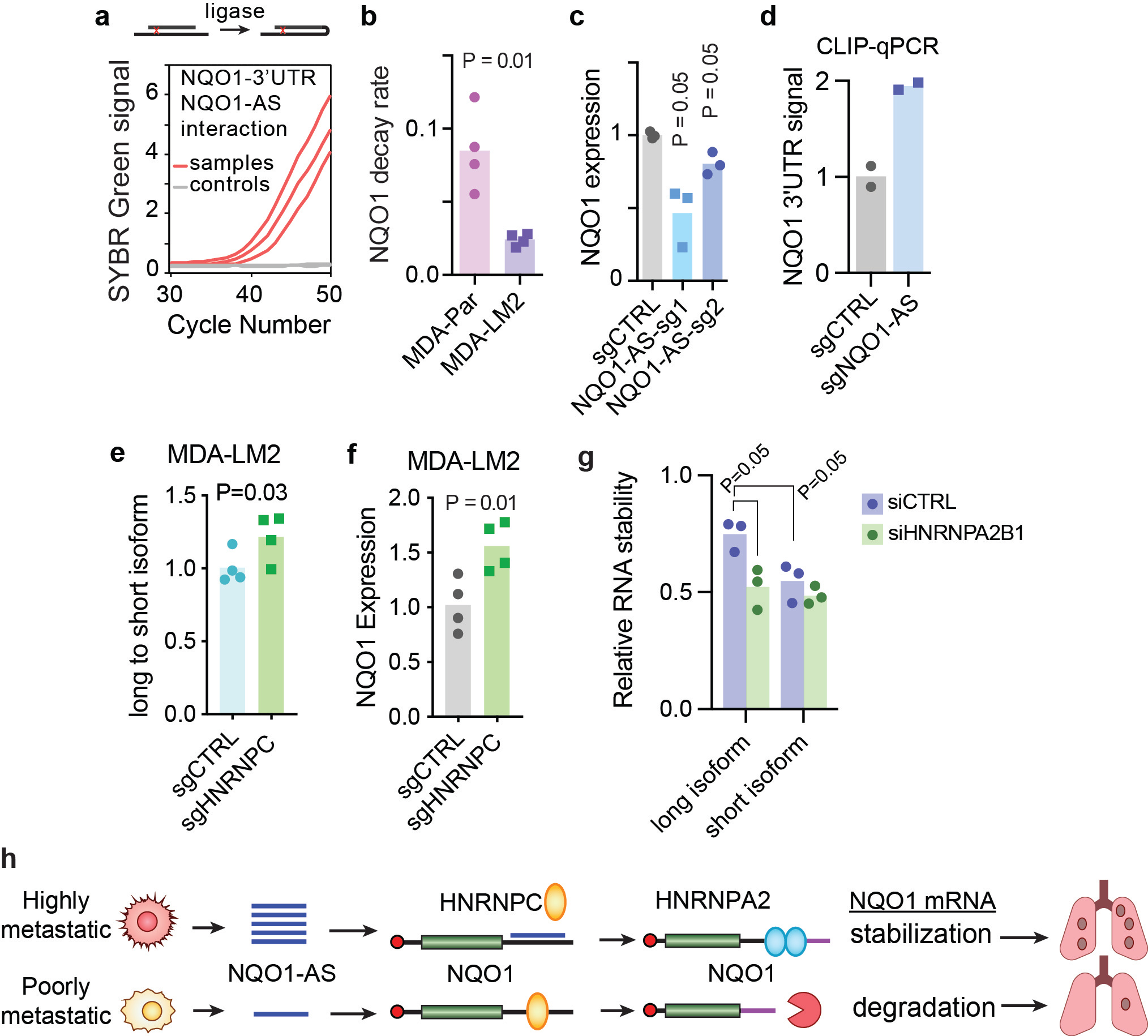 We detected a direct interaction between NQO1-AS and the NQO1 3’UTR using a proximity ligation assay (Fig. 1a). Whole-genome RNA stability measurements1 revealed that NQO1 mRNA is significantly stabilized in MDA-LM2 cells (which upregulate NQO1-AS) relative to the poorly metastatic parental line (Fig. 1b). These findings led us to hypothesize that NQO1-AS binding stabilizes NQO1 post-transcriptionally, and indeed knockdown of NQO1-AS in MDA-LM2 cells caused a decrease in mature NQO1 mRNA (Fig. 1c) with no change in pre-mRNA levels.