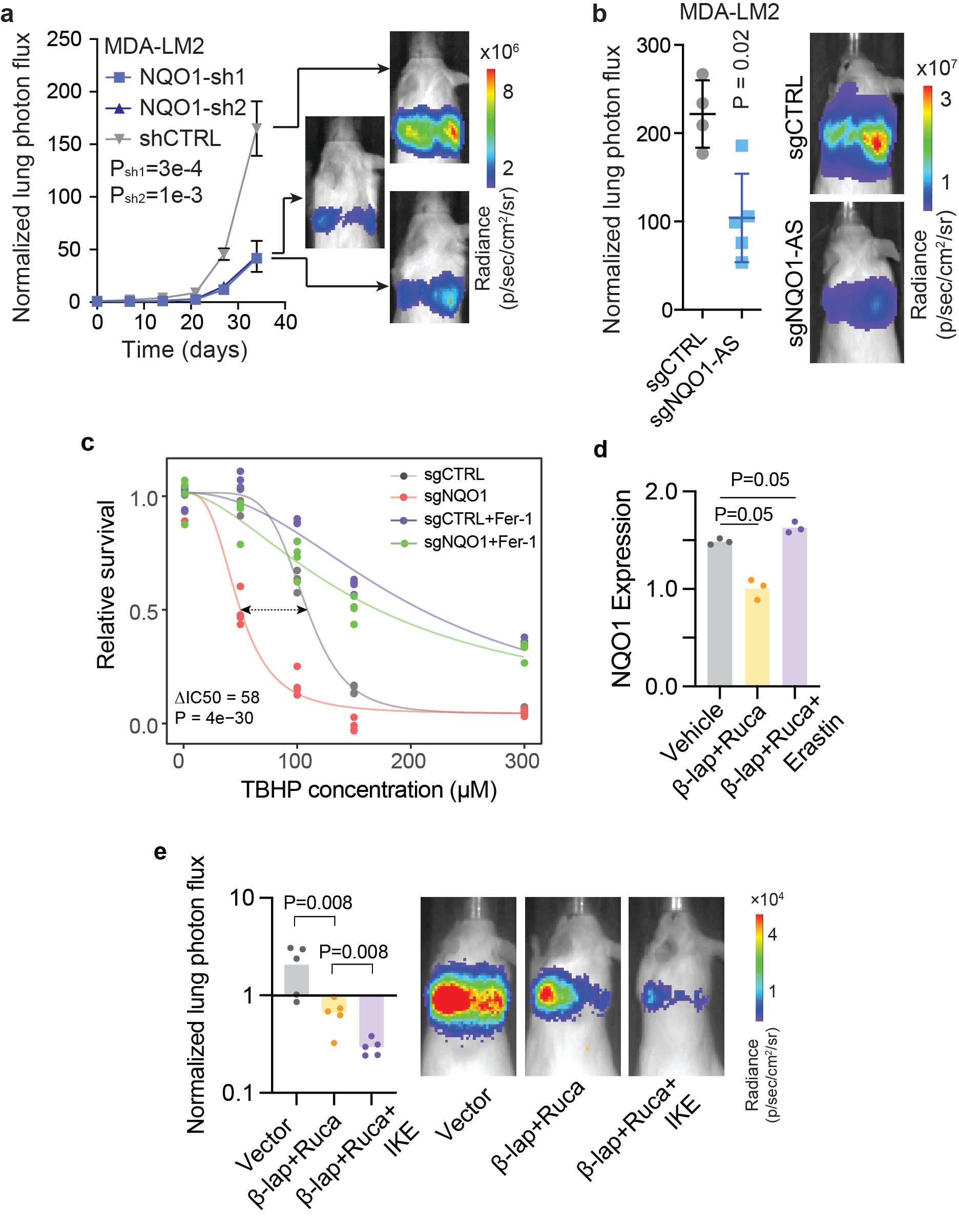 The compound β-Lapachone is metabolized by NQO1 into an unstable hydroquinone that spontaneously generates superoxide14, leading to programmed necrosis of cancer cells15. β-Lapachone has proved effective in cancers with increased NQO1 expression; however, its sustained use at high concentrations causes anemia in both humans and animal models16. Combining β-Lapachone with poly(ADP-ribose) polymerase (PARP) inhibitors results in synergistic anti-tumor activity17, and we hypothesized that adding a ferroptosis inducer could further increase the potency of this therapeutic regimen. This hypothesis was in part based on the observation that MDA-Par cells exhibit a high degree of heterogeneity in NQO1 expression, so targeting PARP and NQO1 while inducing ferroptosis could simultaneously kill subpopulations of cancer cells with high and low NQO1 expression. To test this, we treated MDA-LM2 cells with either β-Lapachone + Rucaparib (a PARP inhibitor), Erastin, or vehicle control and measured NQO1 expression in the surviving cells (Fig. 2d). We found that the cells that survived β-Lapachone + Rucaparib treatment had relatively low NQO1, whereas the cells that survived Erastin treatment had relatively high NQO1, indicating that these treatments target distinct subpopulations. To test our proposed combination therapy in vivo, we conducted a lung colonization assay with MDA-Par cells and found that the addition of IKE improved the efficacy of β-Lapachone + Rucaparib treatment (Fig. 2e). This suggests that the role of NQO1 as a protective agent against ferroptosis can be exploited by treatment with a ferroptosis inducer in combination with established NQO1-inhibitor therapies.