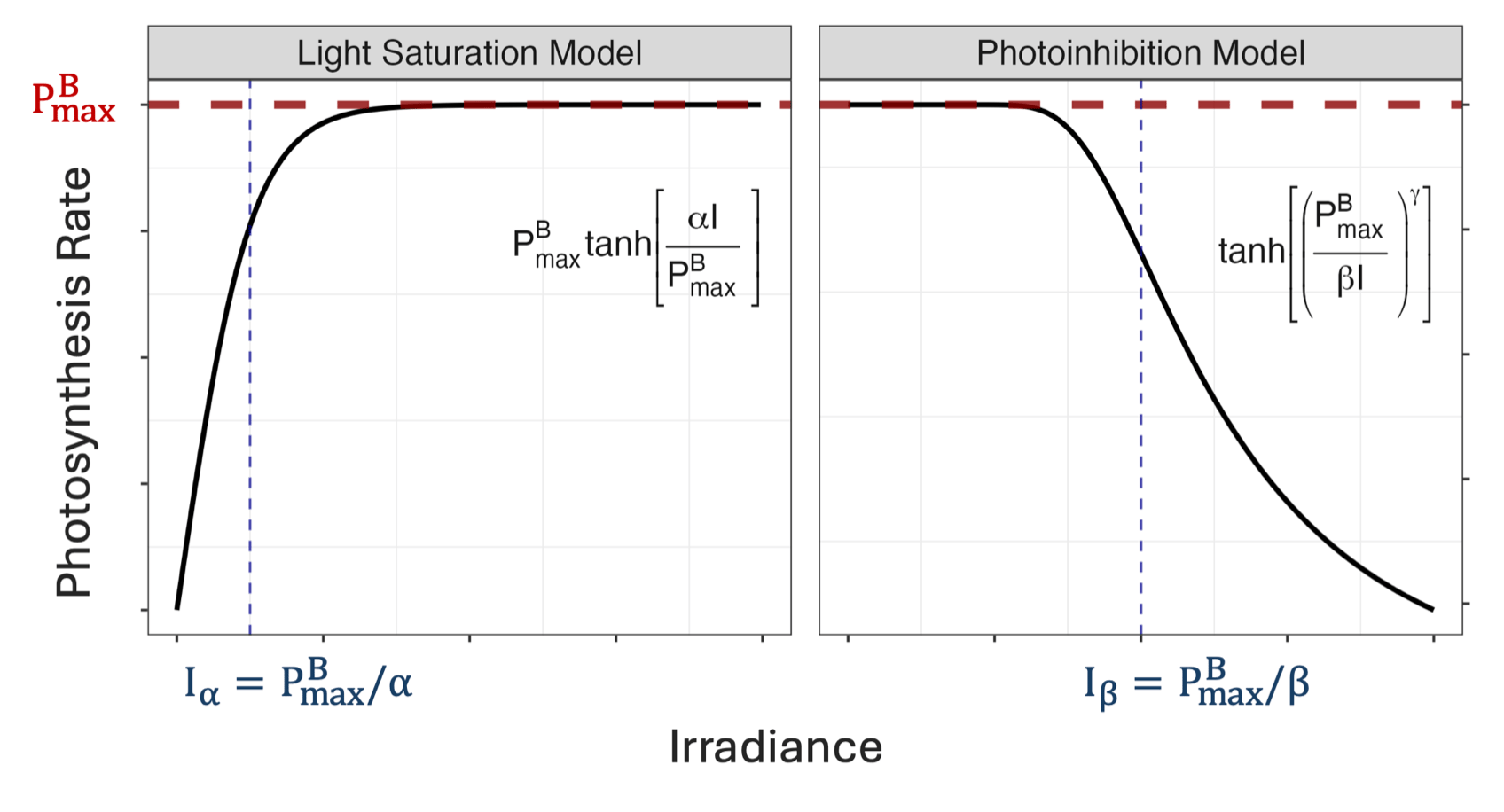 When photoinhibition is absent, PI curves can be described reliably using light-saturating models (LSMs; Jassby & Platt, 1976). But when photoinhibition is present, the common practice is to multiply LSMs by an exponential decay function. This forces the curve to have a single maximum and prevents the model from capturing the plateau phase often observed in real data. Biologically, these equations assume that photoinhibition begins at very low light and progressively overwhelms photosynthetic capacity, conflating the photodamage and photoinhibition concepts!