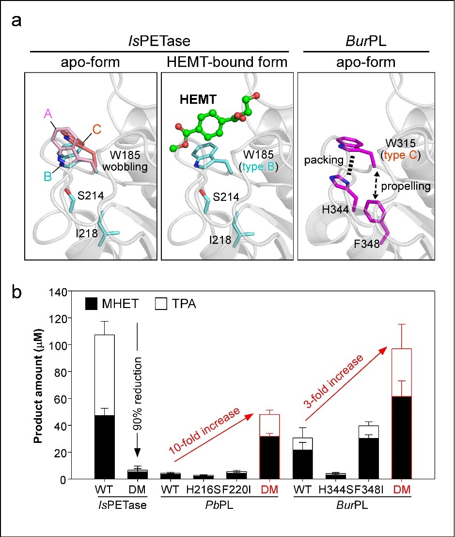 Although we were frustrated by the biochemical results, we kept working on structural analyses. The crystal structure of an IsPETase-homologous enzyme from Burkholderiales bacterium, denoted BurPL, was solved. The overall structure is highly identical to that of IsPETase, but the β6-β7 loop that accommodates the W185-corresponding residue of BurPL is less flexible than that of IsPETase. In BurPL, the side chain of a Phe residue that is located beneath the W185-corresponding residue propels the Trp Cα to keep β6-β7 loop in position. In IsPETase, the Phe-corresponding residue is replaced by Ile (I218), whose side chain is smaller than the phenyl group of Phe such that the spatial hindrance of the W185-locating β6-β7 loop is relieved. We were amazed to find that the Ile residue is also unique to IsPETase, and the corresponding residue in other homologous enzymes is Phe (Figure 1a). We thus introduced His-to-Ser and Phe-to-Ile double mutation (DM) in BurPL and found that the variant showed threefold increase in PET-hydrolytic activity. For another IsPETase-like cutinase from Polyangium brachysporum (PbPL), introducing DM enhances its PET-hydrolytic activity by ~tenfold (Figure 1b). We also introduced DM in five cutinases that are more phylogenetically distant from IsPETase, and four of them show significant increase in PET-hydrolytic activity, including two that lack the IsPETase unique extra disulfide bond and loop. These results indicate that Ser/Ile DM might be a minimal requirement to transform a canonical cutinase to a specified PET hydrolase, and the predecessor of IsPETase might acquire Ser/Ile DM to increase the flexibility of substrate-binding pocket to increase the binding capacity to the bulkier PET.