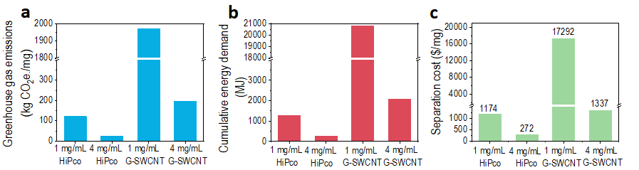The distinct improvement in the separation yield of SWCNTs by increasing the concentration of SWCNT solution is mainly ascribed to the enhanced transfer of SWCNTs from bulk solution to the gel surface and thus their adsorption onto gel, which reduces the proportions of unadsorbed and irreversibly adsorbed SWCNTs. By life techno-economic and life cycle assessments, the mass separation of single-chirality species showed distinct advantages in efficiency, energy consumption and cost compared with the previous methods by increasing the concentration of SWCNTs. This dispersion and separation strategy provide a method for the industrial separation of single-chirality SWCNTs over a wide diameter range.