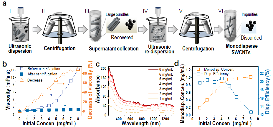 The preparation of monodisperse raw SWCNT solution is a critical step in the separation of single-chirality SWCNTs that determines the structural purity of the separated SWCNTs [5]. However, high concentration and high dispersity are difficult to reconcile, which limits the separation efficiency of single-chirality SWCNTs. Huaping Liu and his colleagues developed a strategy for dispersing a highly concentrated individualized SWCNT solution by redispersion, in which the SWCNT solution was first ultrasonically dispersed, followed by ultracentrifugation and reultrasonic dispersion. With this technique, the dispersible initial concentration of SWCNTs increased from 1 to 8 mg/mL, and the corresponding concentration of the resulting individualized SWCNT solution increased from 0.19 to ~1.02 mg/mL. And the separation yields of multiple single-chirality species, including (6, 4), (6, 5), (11, 1), (7, 5), (7, 6), (8, 3), (8, 4) and (9, 1), were increased by approximately six times to the milligram scale in one separation run with gel chromatography.