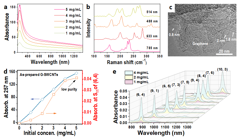 This dispersion technique was shown to be applicable for the low-cost and commercial hybrid of graphene and SWCNTs (G-SWCNTs) with a wide diameter range of 0.8-2.0 nm. By increasing the initial dispersible concentration of the G-SWCNT raw materials from the typical 1 to 4 mg/mL, the separation yield of single-chirality SWCNTs was increased by more than one order of magnitude. In particular, nine types of single-chirality SWCNTs, namely, (6, 4), (6, 5), (7, 3), (7, 5), (7, 6), (8, 4), (9, 1), (9, 4) and (10, 3), were prepared on the submilligram scale.