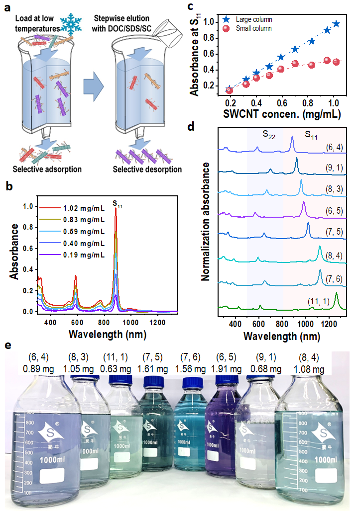 Most recently, Prof. Huaping Liu's research group from the Institute of Physics (IOP) of the Chinese Academy of Sciences (CAS) reported a simple, yet effective, method to increase the yield of gel chromatography separation of single-chirality carbon nanotubes by enabling significantly higher concentrations of raw nanotubes solution. With this technique, milligram-scale separation of multiple single-chirality SWCNTs have been achieved. This study was mostly recently published in Nature Communications (Preparing high-concentration individualized carbon nanotubes for industrial separation of multiple single-chirality species, Nature Communications, 2023, 14:2491).