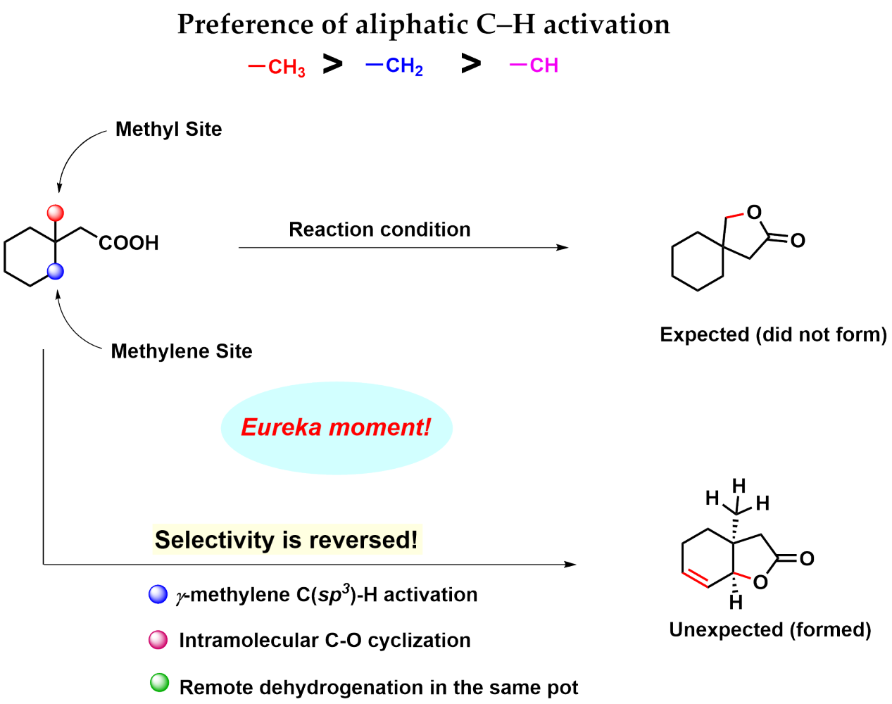 We at Prof. Debabrata Maiti's laboratory have been exploring the reactivity of the carboxylate group in activating sp3 C-H bonds for several years now. While we were exploring the C-H functionalization possibilities in the realm of cyclic aliphatic acids, we found this amazing reaction that shows reverse site-selectivity and forms bicyclic lactones with unsaturation in the cyclic ring. We are gonna talk about the story of this project and the journey in between.