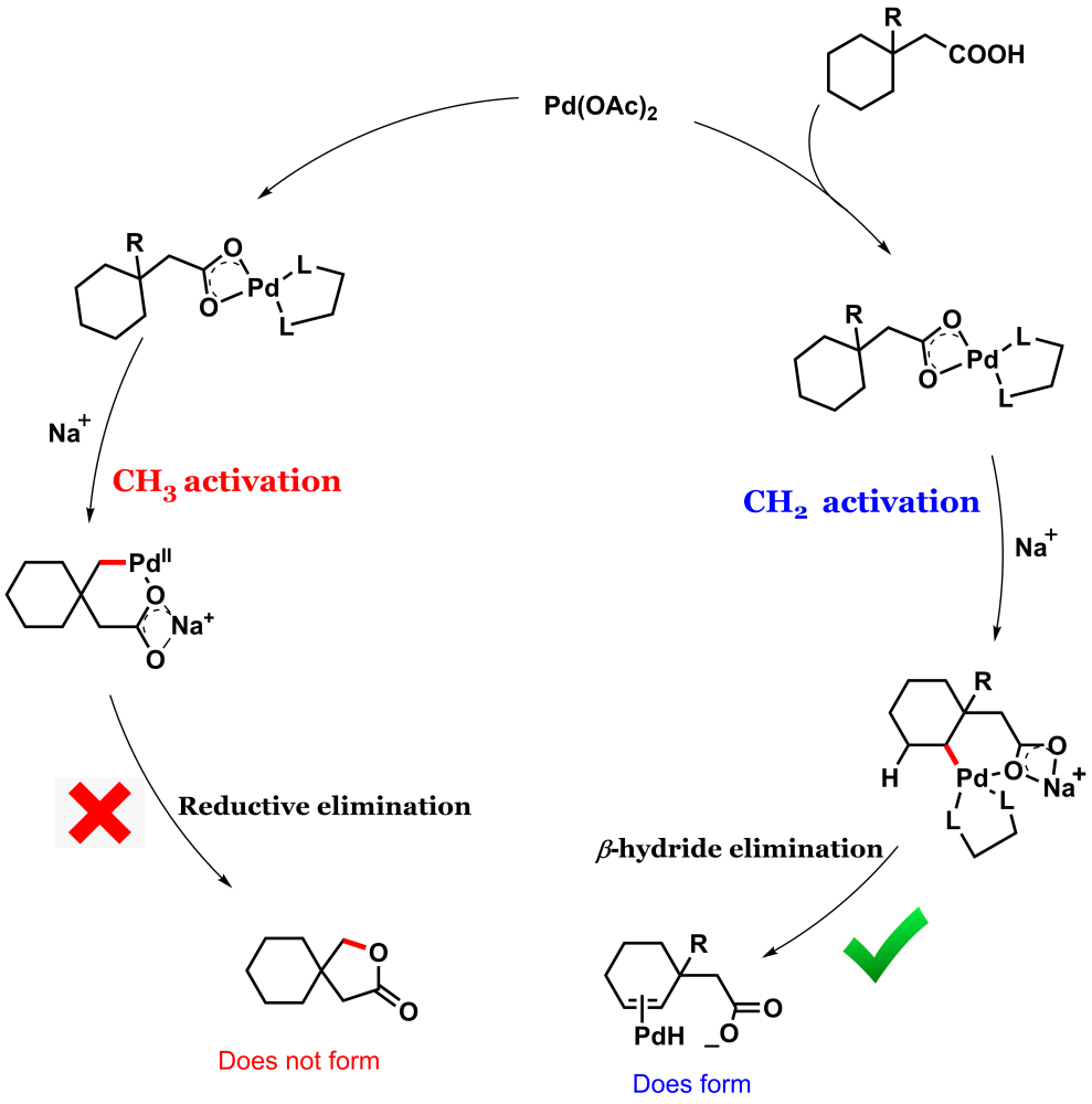 Whereas the methylene activation (though a little more strenuous than methyl activation) is accompanied by a more favorable process of beta-hydride elimination and thus the system favors the methylene activation over methyl (Figure 5). More details are in the paper. It is as if the system exhibits delayed gratification instead of instant gratification.
