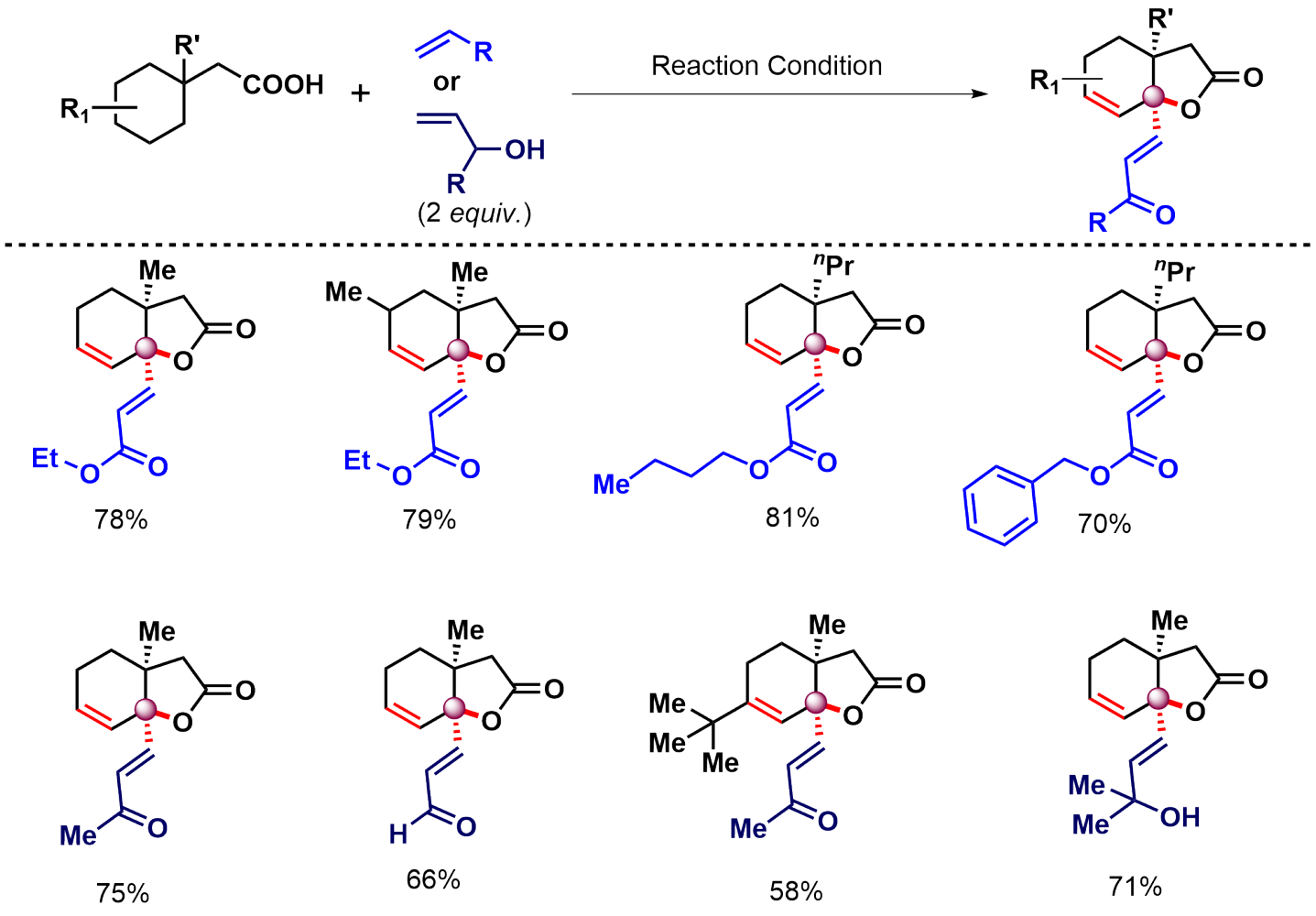 What intrigued us more is when we tried to make the reaction work in the presence of an external partner. We call it the intermolecular version of the reaction. If you don't add anything extra (except the substrate) in the reaction, it forms unsaturated lactones (Figure 2), however, if you add an olefin or an allyl alcohol, it forms unsaturated lactones containing olefins (Figure 3).