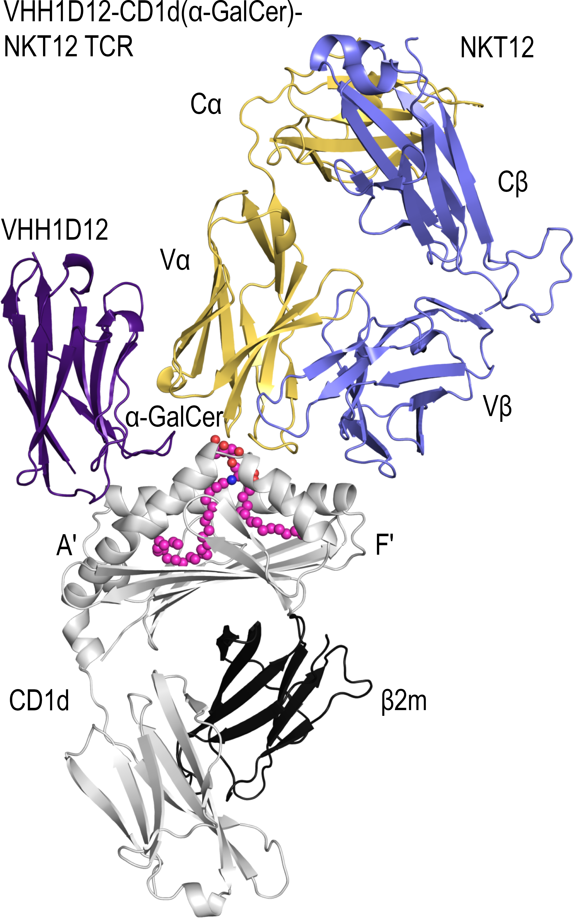 In our recently published paper in Nature Cancer we report that distinct CD1d specific VHHs can selectively block the activity of individual CD1d- restricted T cell subsets and identified VHH1D12 to be particularly unique as it combined blocking of type 2 NKT cell activation with the potent induction of type 1 NKT cell activation, the latter even in the absence of normally required exogenous glycolipid antigens such as α-GalCer. Using crystallography co-first authors Roeland Lameris and Adam Shahine elucidated that VHH1D12 simultaneously contacted CD1d and the type 1 NKT TCR and thereby stabilized this interaction through intrinsic bispecificity (see Figure). VHH1D12 not only outperformed α-GalCer in multiple assays but may also trigger more tumor specific activity as it especially promoted type 1 NKT cell reactivity when CD1d contained (endogenous) low-affinity glycolipid antigens that are common in cancer cells. The unique features of CD1d specific VHHs that we describe have the potential to advance NKT cell based therapies and provide a first example of what may develop into a more broadly applicable novel cancer immunotherapy approach.