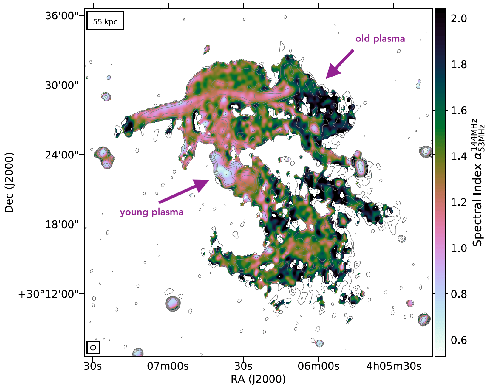 The system turned out to be a galaxy group, first identified in the literature in the infrared band and called Nest200047. The group is made of about twenty galaxies and is located at a distance of ~200 light years from us (z=0.1795). At its center there is a massive elliptical galaxy called MCG+05-10-007, whose central black hole is producing jets or relativistic particles and magnetic fields, which we can observe in the radio band. We actually observe multiple pairs of bubbles with different ages, which have been produced by the black hole during repeated outbursts over its lifetime. The spectral index map shown in Fig. 2 was obtained by combining the two LOFAR datasets at 144 MHz and 53 MHz and clearly shows us that the radio emission closer to the central galaxy is younger (flatter spectral index), while the emission at the outskirts is very much older (steeper spectral index).