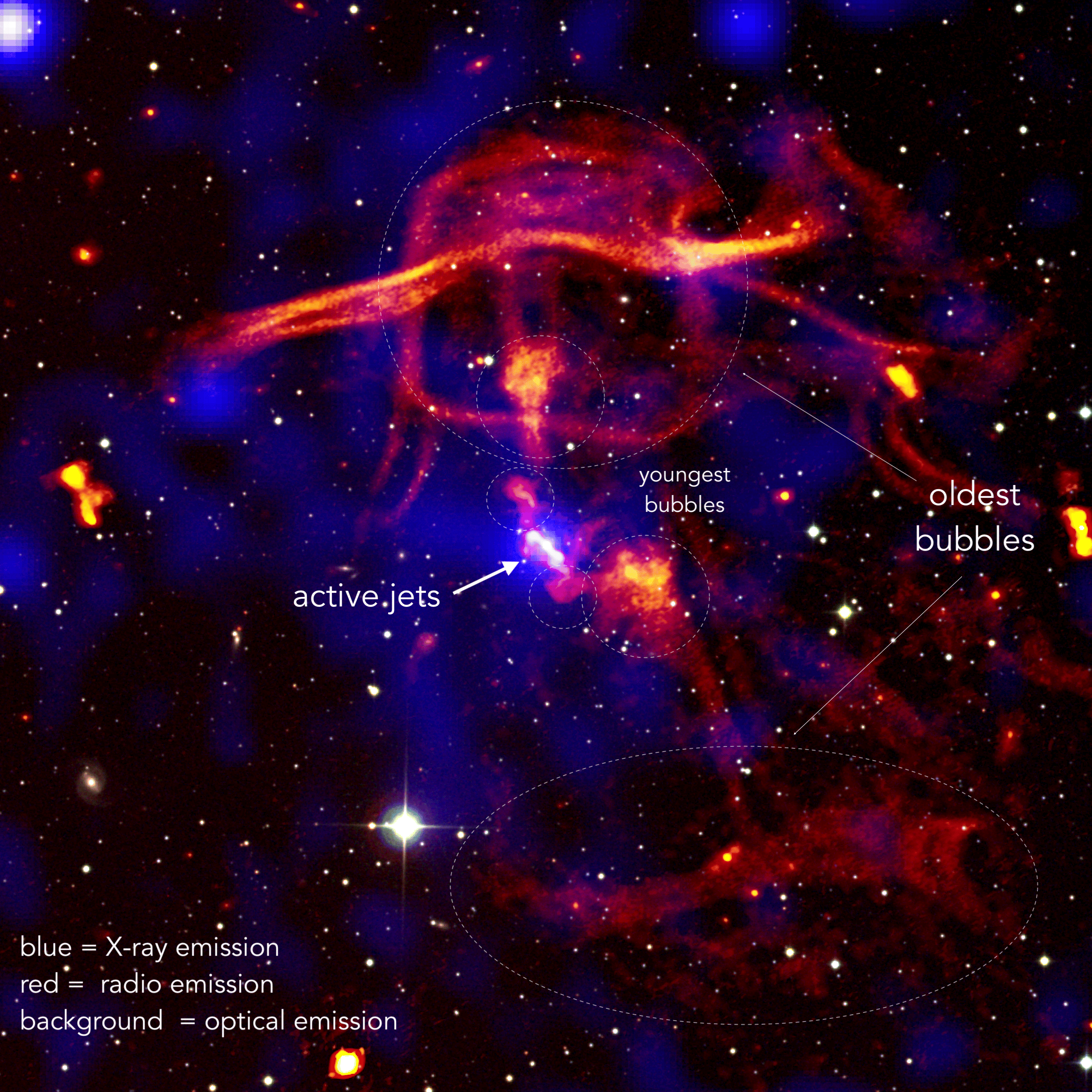 The most stunning thing, however, is that we observe for the first time in great detail, how the bubbles rise and transform into the surrounding intergalactic medium over hundreds of million years. The transformation of the old bubbles from approximately spherical shapes to mushroom shapes and rings is very similar to what happens during powerful explosions or volcanic eruptions on Earth. This happens because in all these cases the medium surrounding the bubbles (the intragroup medium and the Earth atmosphere, respectively) is stratified, with higher density in the central regions and lower density moving towards the outskirts. For this reason it exerts different pressure to the top and bottom regions of the rising bubbles, shaping their morphology. Moreover, during their rise and likely influenced by a turbulent environment, the bubbles start getting disrupted and shredded into thin filamentary structures, and eventually they are expected to completely mix up with the intragroup medium.