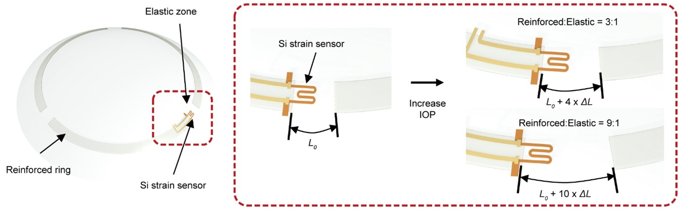 The most challenging part of this research was the development of the strain sensor to measure the intraocular pressure. Very little strain is caused by the change in the intraocular pressure, so, even though the strain sensor had high sensitivity, it was very difficult to measure the change in the intraocular pressure. To overcome this problem, we used a rigid-soft hybrid substrate and a highly-doped Si nanomembrane-based strain sensor that had serpentine geometry. In the previous papers, a rigid-soft hybrid substrate was used to protect the materials and electronics against mechanical stress by locating the electronics on the rigid area (1,2). However, we exploited the mechanical properties of the rigid-soft hybrid substrate inversely. To explain, when the soft contact lens is deformed by a change in intraocular pressure, the rigid region has a negligible change, and the deformation is concentrated on the soft region. We used this effect of concentrating the strain. By fabricating the strain sensor on the soft region where the mechanical deformations are concentrated, the Si strain sensor was able to measure the change in intraocular pressure. It was possible to overcome the challenging part by thinking differently from previously reported papers and fabricating the device following the opposite concept. We will never forget how we felt when this creative idea was successful.
