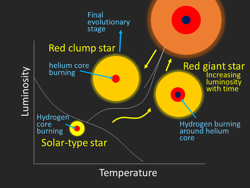 Figure 2: Internal structure and evolution of low-mass stars. The internal structure of red clump stars is different from red giants with hydrogen nuclear burning around the central core, but the temperature and luminosity of clump stars are indistinguishable from some red giants (Image Credit: Wako Aoki, National Astronomical Observatory of Japan).