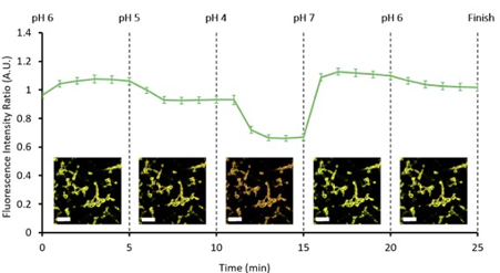 The first hurdle was to check that the nanosensors penetrated through the biofilm matrix, distributed throughout and did not significantly affect growth. Tick (Figure 2). The second was to demonstrate that they dynamically reported on pH changes as solutions of known acidity were applied. Tick (Figure 3). Thirdly, the pH could be reported in a reversible manner over time by first decreasing pH with buffers, and then increasing it. Tick (Figure 4)!