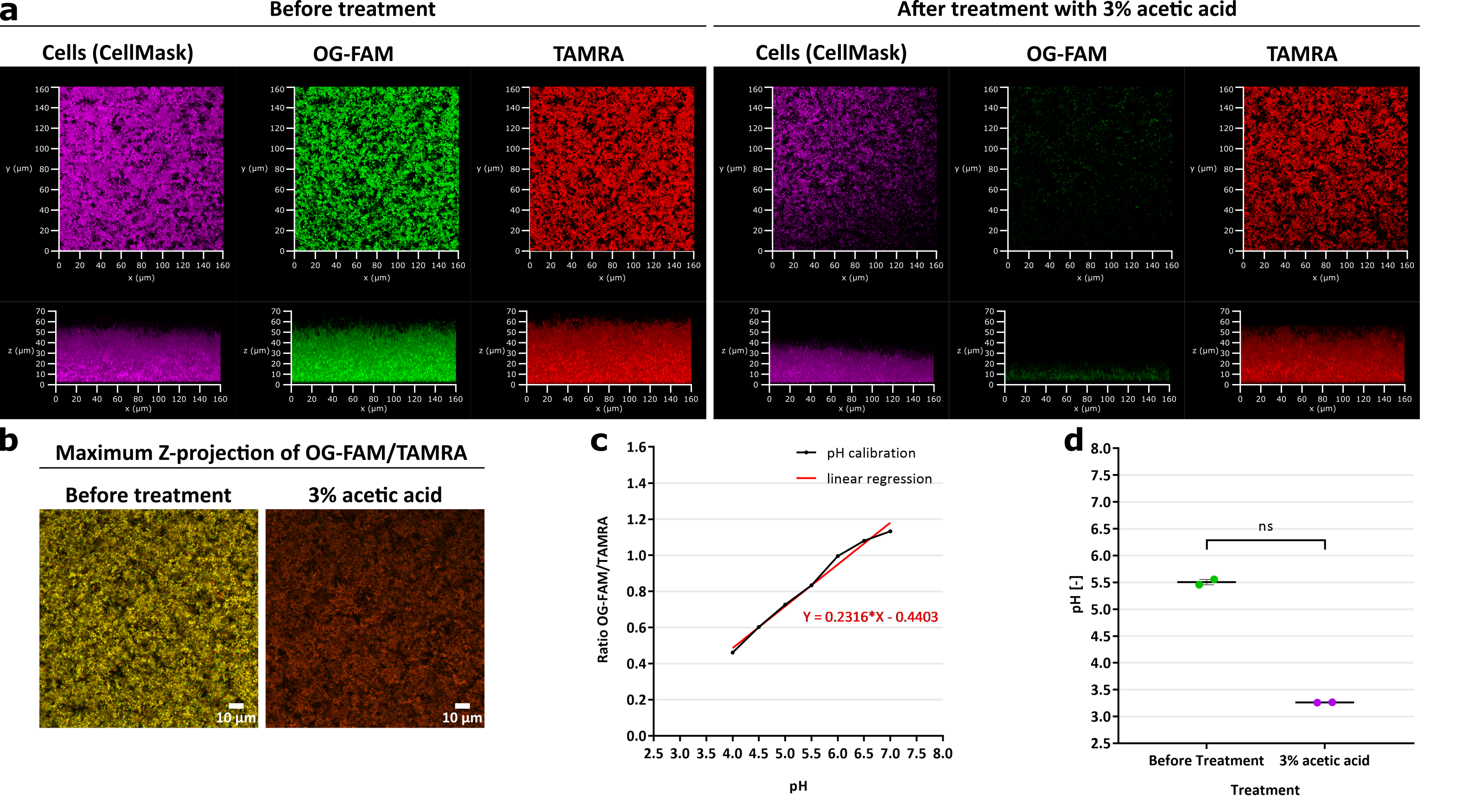 Figure 3. Nanosensors detect pH changes in response to the exogenous addition of acid to P. aeruginosa biofilms. P. aeruginosa was inoculated into M9 glucose containing 1 mg mL-1 nanosensors. The cells were incubated at 37°C under static conditions for 48 h. (a) Cells were stained with CellMaskTM (magenta) and nanosensor channels are presented for OG-FAM (green, pH-sensitive) and TAMRA (red, reference). Z-stack images were taken with a Zeiss CLSM using a 40x objective before the treatment (left) and 30 min after the treatment with 3% (v/v) acetic acid (right). Top images represent 3D top view, bottom images 3D side view of biofilms. (b) Maximum Z-projection of OG-FAM/TAMRA overlay before the treatment (left) and after the treatment (right). (c) Calibration curve of nanosensors using pH buffers. The linear part (pH 4.0 to 7.0) was taken to calculate the linear regression (red) for the pH determination of the biofilm. (d) Calculated pH of the biofilms before and after the treatment with 3% (v/v) acetic acid. Error bars represent standard error measured for different biofilm images, where n = 2, with p<0.001 = ***.