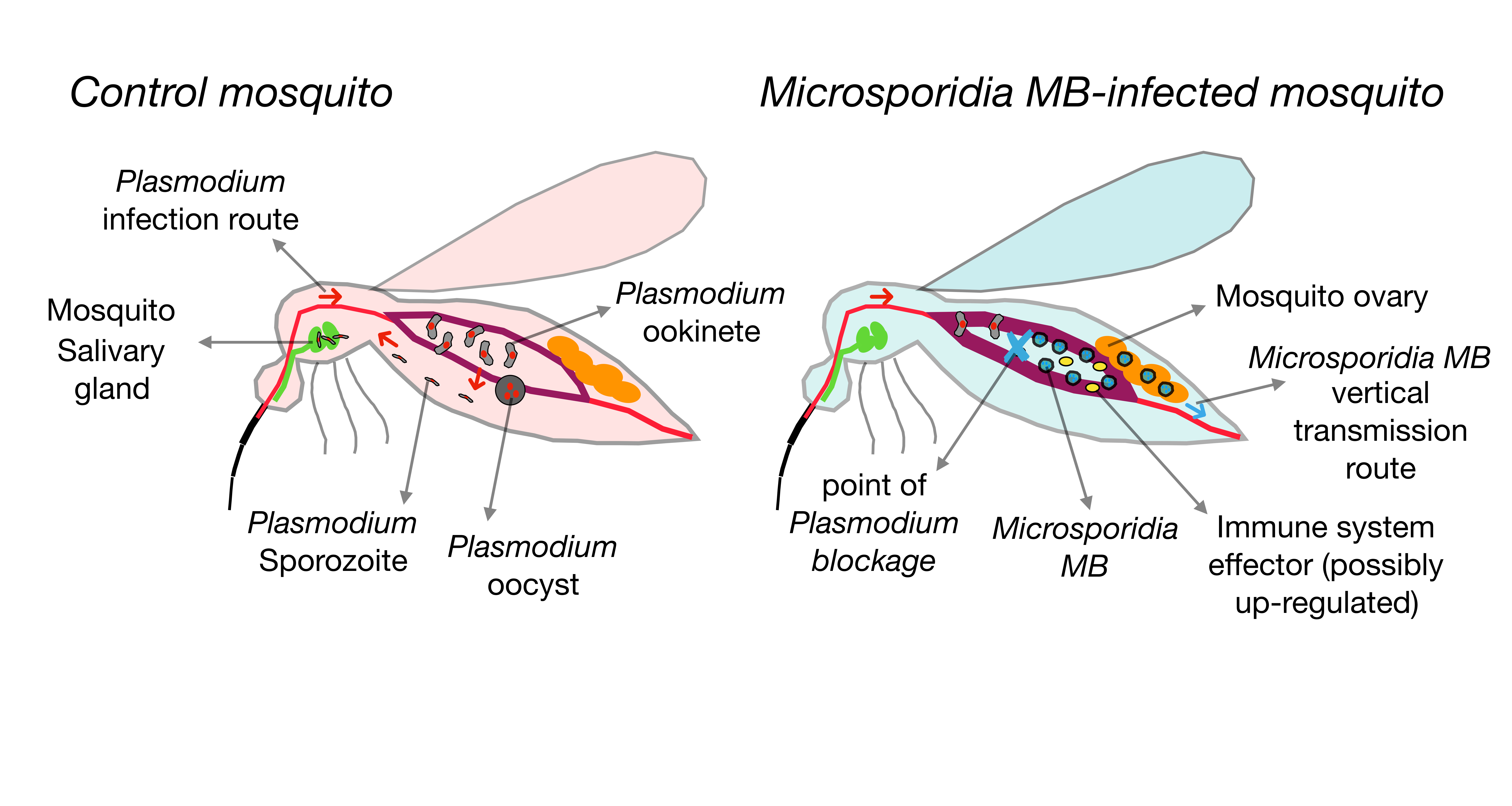 Figure 2: Schematic showing the model for Microsporidia MB-induced Plasmodium protection in Anopheles mosquitoes. In control mosquitoes the Plasmodium infection cycle is able to progress, whereas in Microsporidia MB infected mosquitoes, Plasmodium is blocked prior to traversing the mosquito midgut.