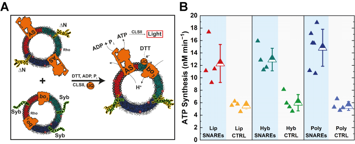 Next, we examined the SNARE-mediated membrane and content mixing. Remarkably, SNAREs were able to provide sufficient energy to trigger prompt and efficient full fusion of man-made membranes, which we demonstrated through integration of two respiratory enzymes towards a coupled energy regeneration module (a minimal respiratory chain), whereby the activity of the module in polymer membrane surpassed the one determined in their natural counterparts (Fig. 2).