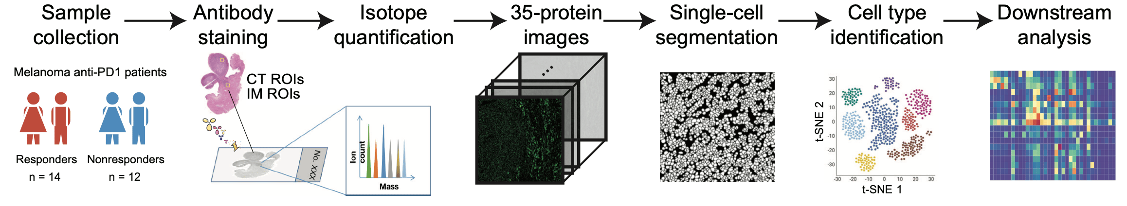 Single-cell technologies have enabled extensive analysis of the TME, including cellular compositions, trajectories and cell-cell interactions. We used imaging mass cytometry (IMC), a multiplexed imaging technique to measure the levels of proteins at single-cell resolution, to analyze tumor tissues from melanoma patients receiving anti-PD-1 therapy (Figure 1).