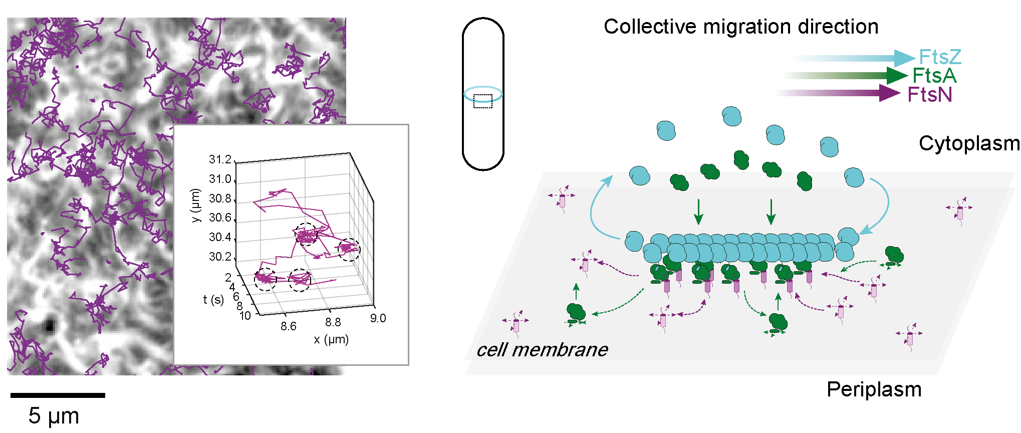 The main surprise came when we looked at single molecule behaviour - none of the proteins in the reconstituted assembly moved directionally with the filaments. Instead, the cytoplasmic peptide of FtsN was transiently captured to FtsZ filaments and afterwards diffused randomly away, in a constant game of chase and capture (see the figure below). The collective motion of the transmembrane proteins with FtsZ is an emergent behaviour, controlled by treadmilling dynamics. The bottom line - FtsZ does not move individual transmembrane proteins, but it still moves the signal on when and where to activate cell wall synthesis.