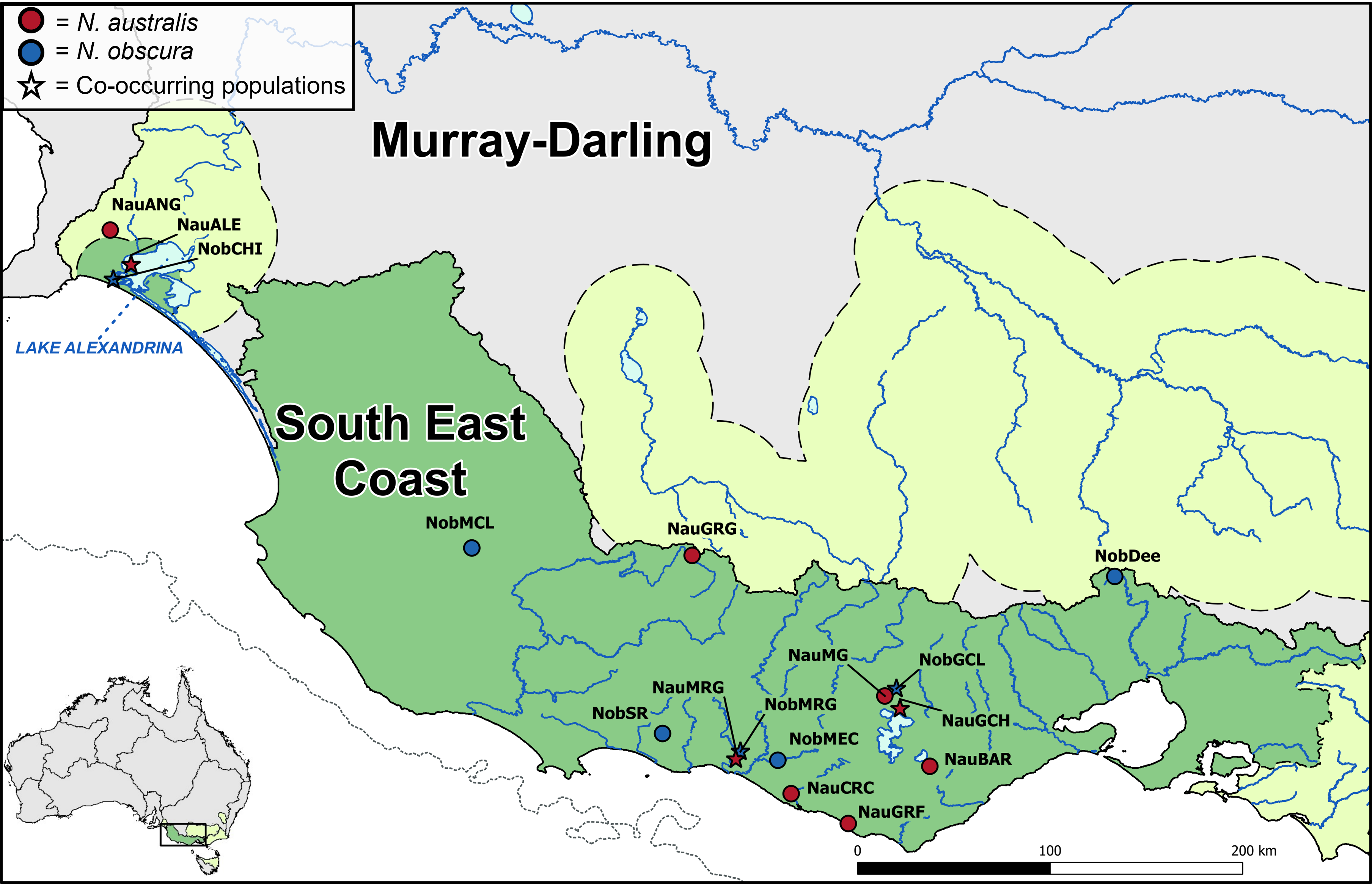 Our research focused on a pair of co-distributed freshwater fishes known as the southern (Nannoperca australis) and Yarra (Nannoperca obscura) pygmy perches. These two species are ecologically similar in many ways – both are small, poorly-dispersing habitat specialists which co-occur in creeks and floodplains across southeast Australia. Although the two species are regularly found together, southern pygmy perch have a wider range and are also found in drainages where Yarra pygmy perch does not occur. While overall genetic diversity is low for both species, Yarra pygmy perch populations have exceptionally low diversity (some of the lowest recorded for a freshwater fish [2]); this has not been linked to a recent or historical bottleneck event and is likely the result of a long-term lack of genetic diversity [3].