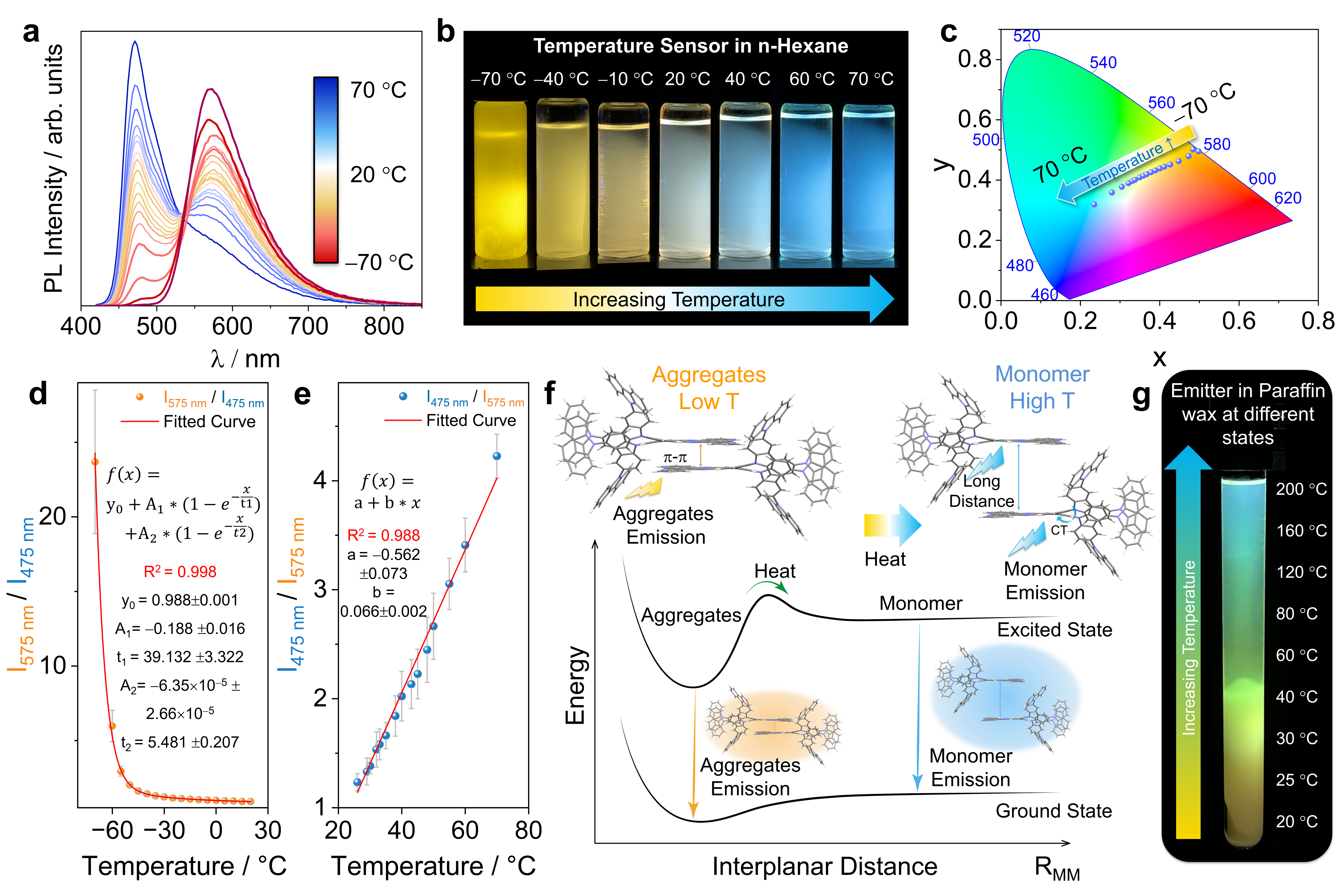 Intrigued by the unusual dual-emissive nature of 2GCzBPPZ, we sought to explore in greater detail the photophysical properties and studied the temperature dependence of the emission in n-hexane. At room temperature, the 1.6× 10-5 M solution of 2GCzBPPZ is dual-emissive and the sample appears to emit white light (Fig. 3a-c), where there are approximately equal contributions from the emission from the monomer (475 nm) and aggregates (575 nm). Upon decreasing the temperature towards the solvent freezing point, the low-energy emission band of 2GCzBPPZ increases in intensity dramatically while the high-energy emission band is completely quenched. The corresponding ratio of the intensity of the emission at 575 to 475 nm (I575/I475) exponentially decreases with increasing temperature from -70 °C to room temperature (r2 = 0.998) (Fig. 3d). On the other hand, increasing the temperature beyond room temperature reveals a complementary effect where the high-energy emission band becomes more intense and the low-energy emission band all but disappears. In this temperature regime, there is a linear relationship between I475/I575 versus temperature (r2 = 0.988 over a temperature region of 25 to 70 °C), corresponding to a ratiometric increase of 6.6% ± 0.2% K−1 (Fig. 3e). Overall, 2GCzBPPZ features excellent temperature sensitivity across a broad range of -70 °C to 70 °C, manifested in distinct colorimetric readout from yellow at -70 °C to white at room temperature and finally to sky blue at 70 °C, corresponding to CIE coordinates of (0.50, 0.49) at -70 °C that shift to (0.23, 0.32) associated with blue emission (Fig. 3c and Movie 1).
