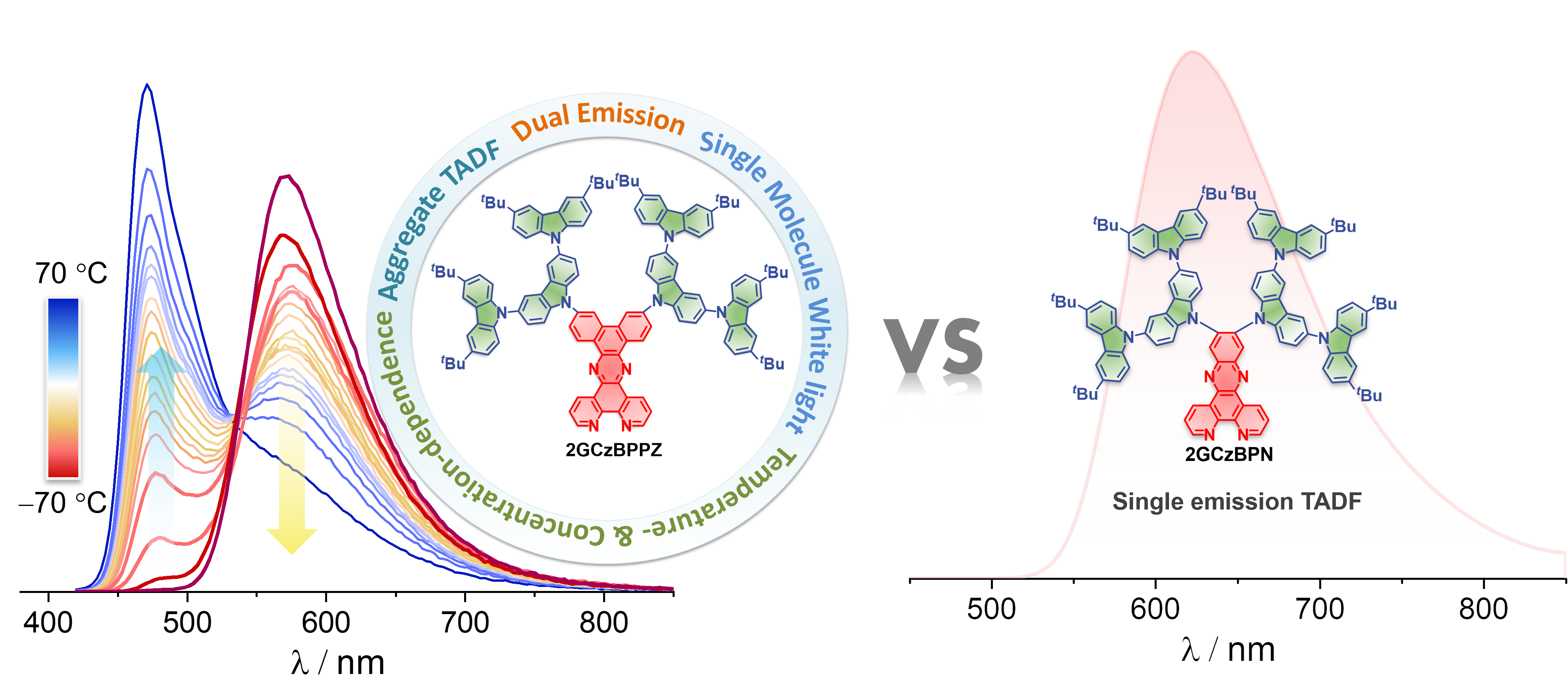 Thermally activated delayed fluorescence (TADF) materials have attracted much attention in the last decades as alternative emitters for noble metal-based phosphorescent complexes in OLEDs, due to their comparable ability to harvest both singlet and triplet excitons to produce light.1, 2 Most of the TADF, and indeed most emissive, compounds only emit from a single, low-lying excited state, adhering to Kasha’s rule.3