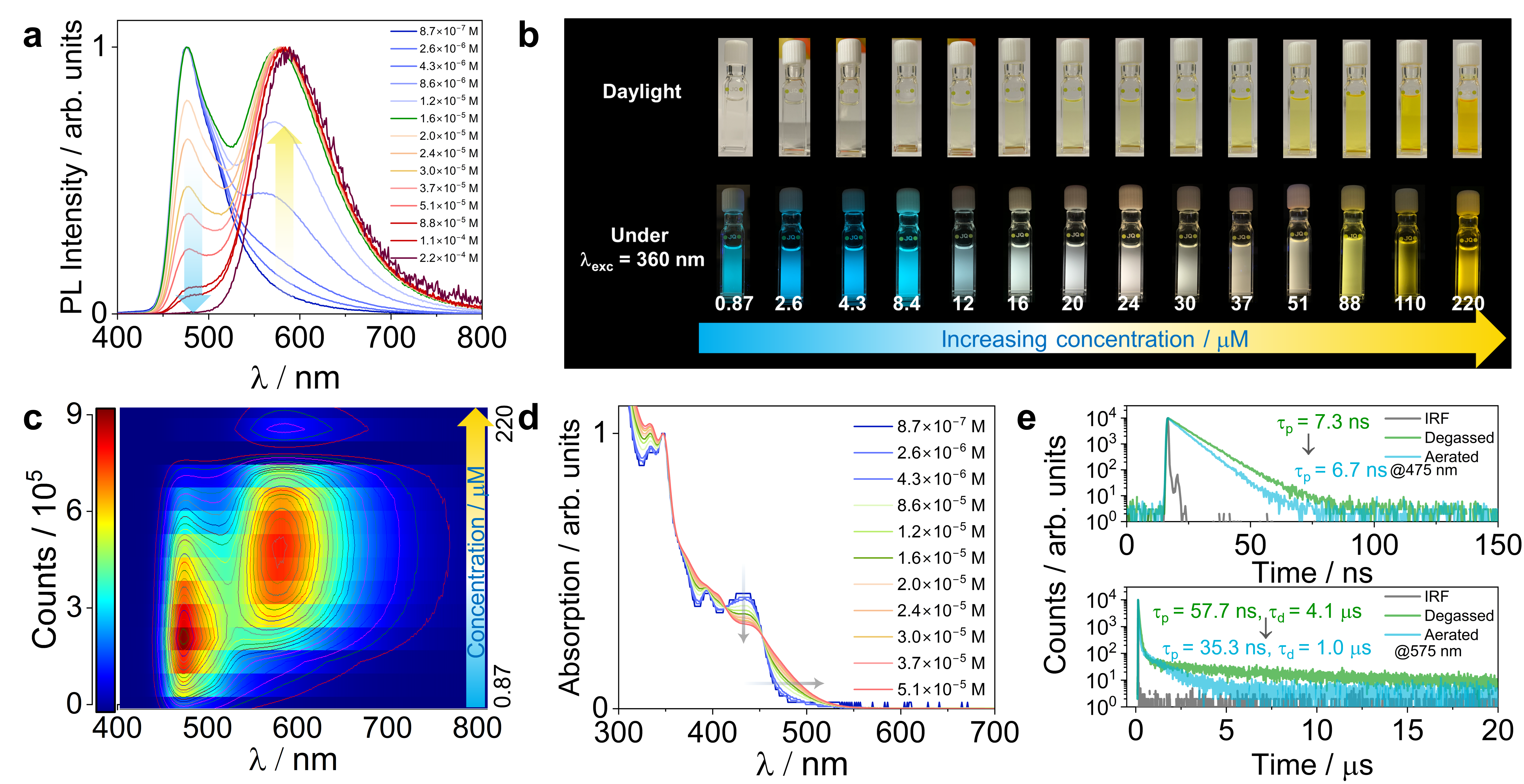 Fig. 2. Aggregation-modulated photophysical behaviour. a Concentration-dependent fluorescence spectra for 2GCzBPPZ in n-hexane solution (λexc = 340 nm). b Corresponding photos under ambient light and using a UV torch (λexc = 360 nm). c Concentration-dependent emission mapping. d Concentration-dependent absorption spectra for 2GCzBPPZ in n-hexane. e PL decay profiles of the emission λem= 475 nm (top) and λem = 575 nm (bottom) under degassed and aerated n-hexane (λexc = 375 nm).