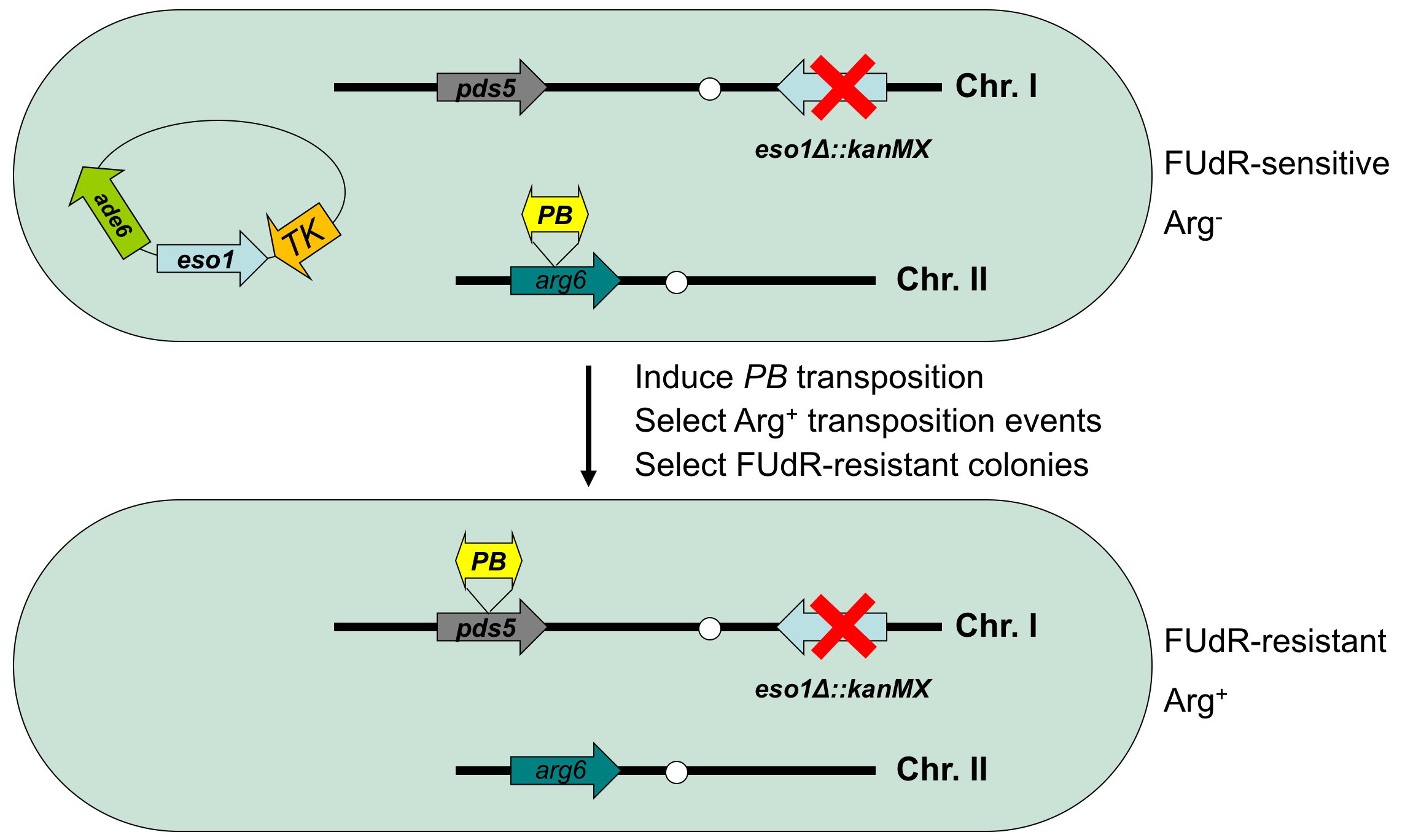 Picture 1. Diagram of T-BOE screening procedure using the bypass of eso1 by PB insertion of pds5 as an example. TK is a marker that can be counter-selected using the drug FUdR. ade6 is a colony color marker whose loss results in colonies turning red on low-adenine media.